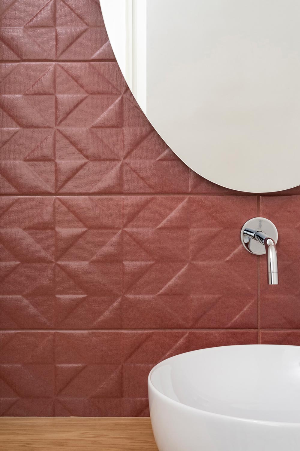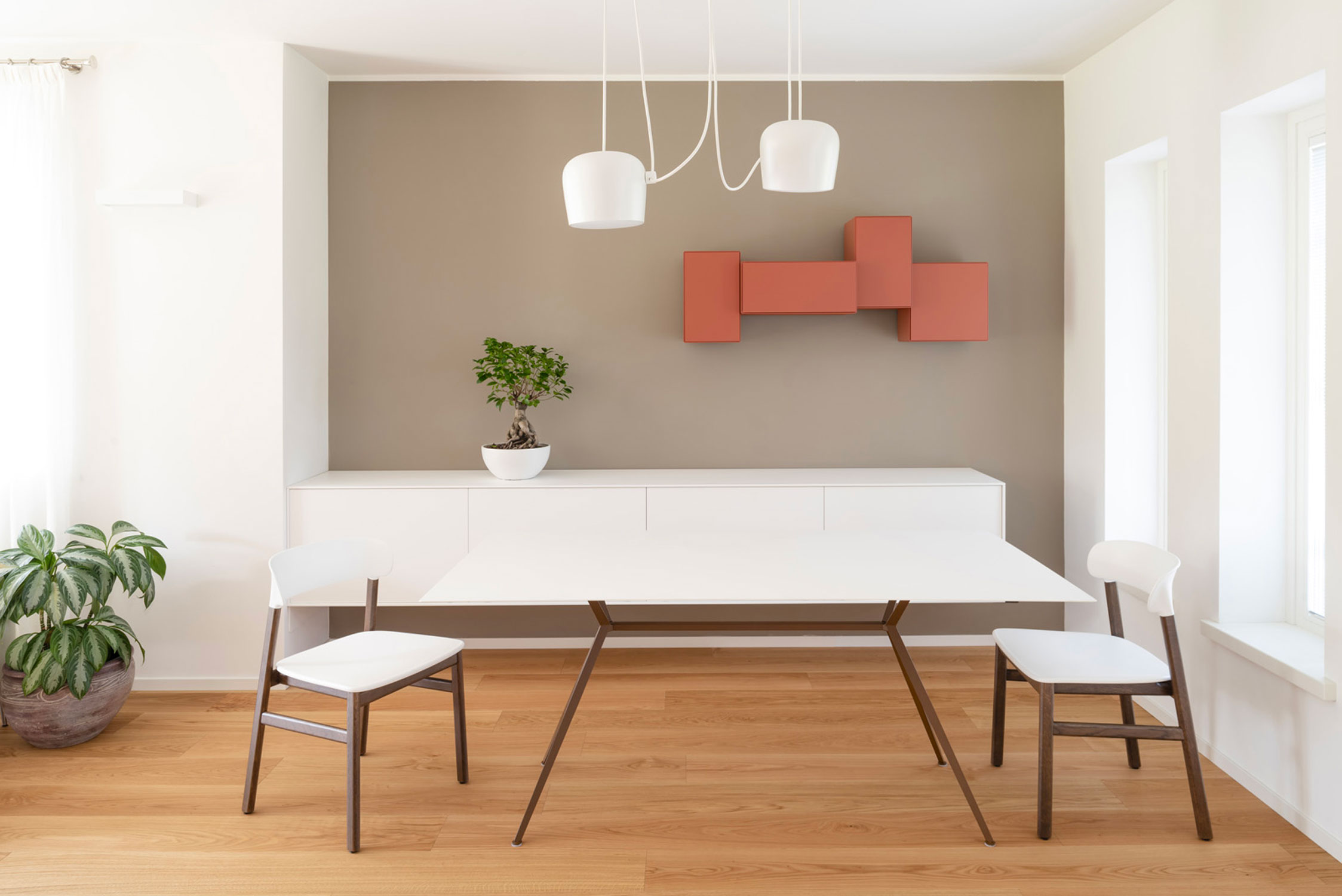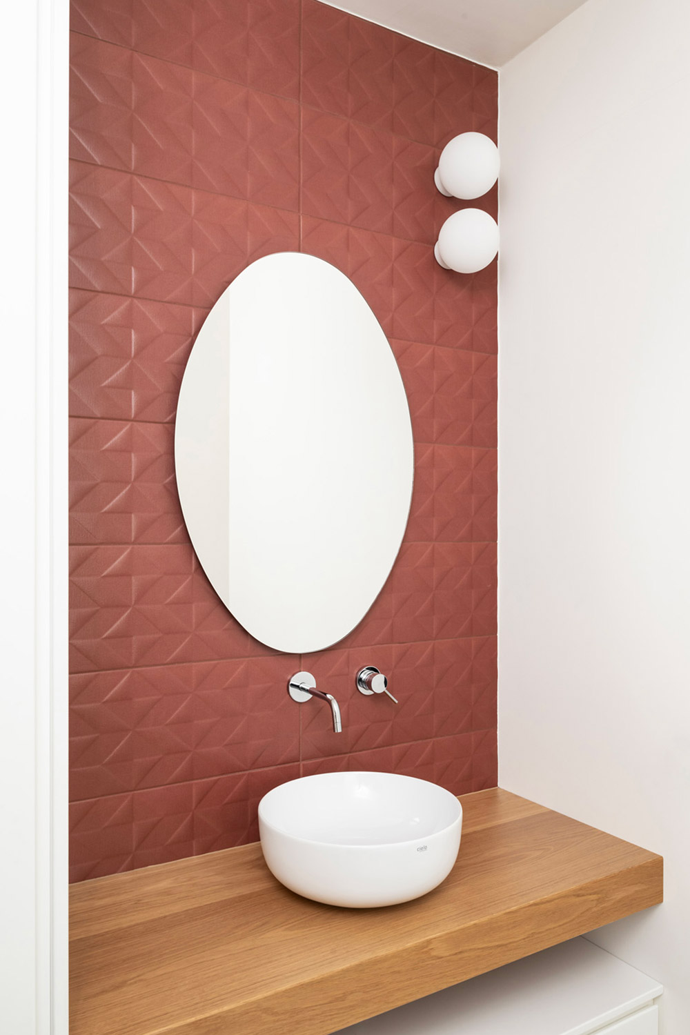 Il tavolo Extendo e le sedie Normann Copenhagen definiscono un linguaggio essenziale. Nel soggiorno, tagli murari e campiture cromatiche diventano episodi architettonici. I bagni esplorano due atmosfere: il primo, rosso scuro e tridimensionale, è caldo e avvolgente; il secondo, verde con micro texture geometrica, costruisce un ambiente più grafico e ordinato.