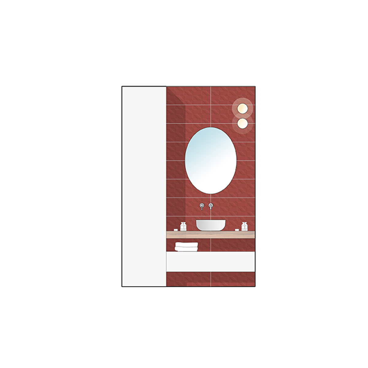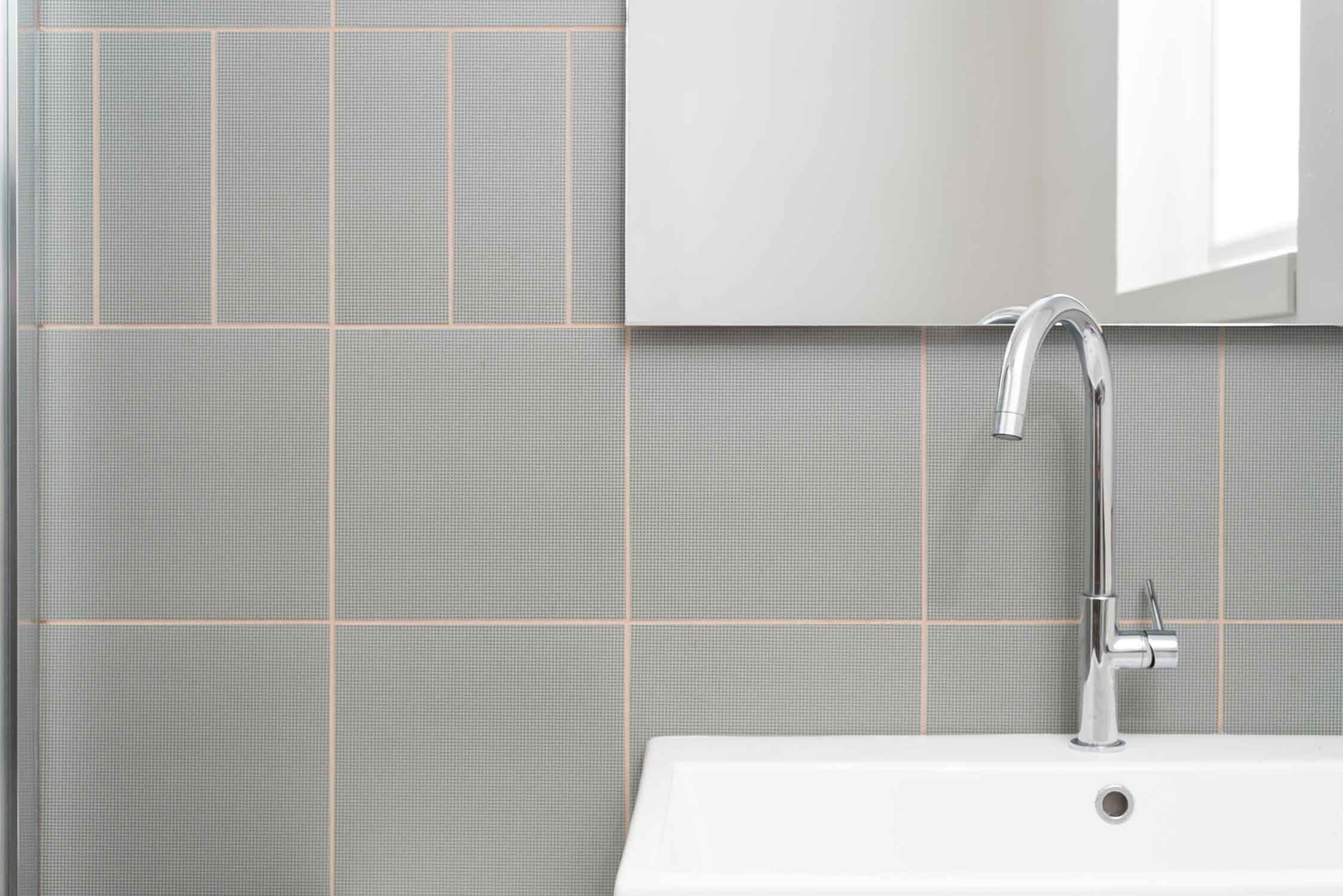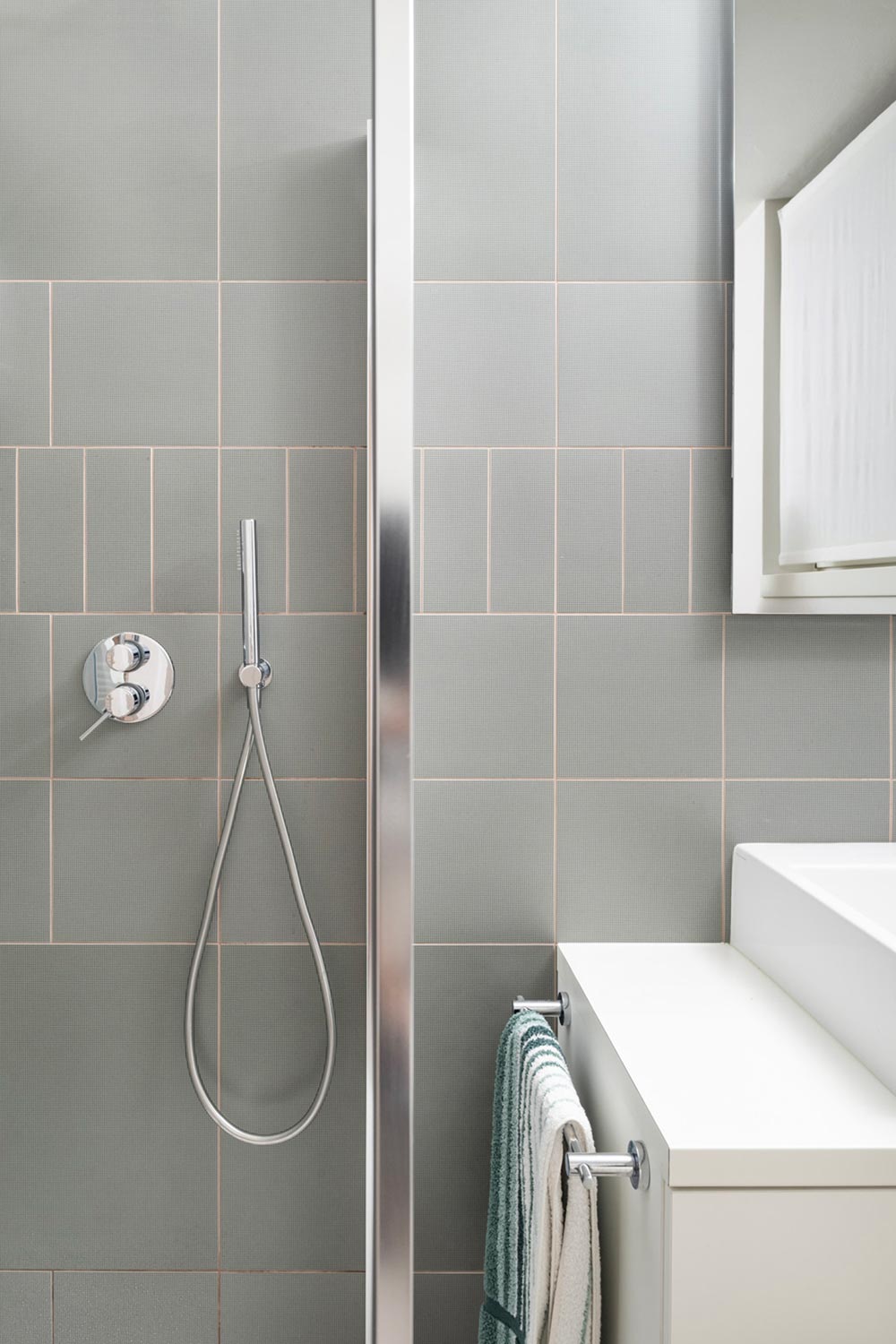 Il tavolo Extendo e le sedie Normann Copenhagen definiscono un linguaggio essenziale. Nel soggiorno, tagli murari e campiture cromatiche diventano episodi architettonici. I bagni esplorano due atmosfere: il primo, rosso scuro e tridimensionale, è caldo e avvolgente; il secondo, verde con micro texture geometrica, costruisce un ambiente più grafico e ordinato.