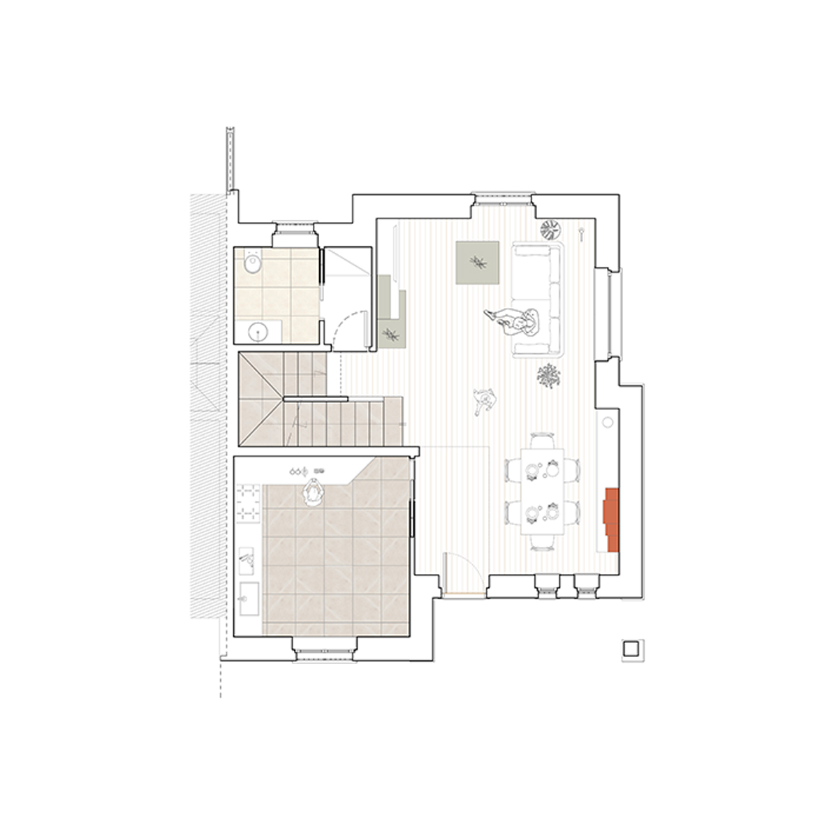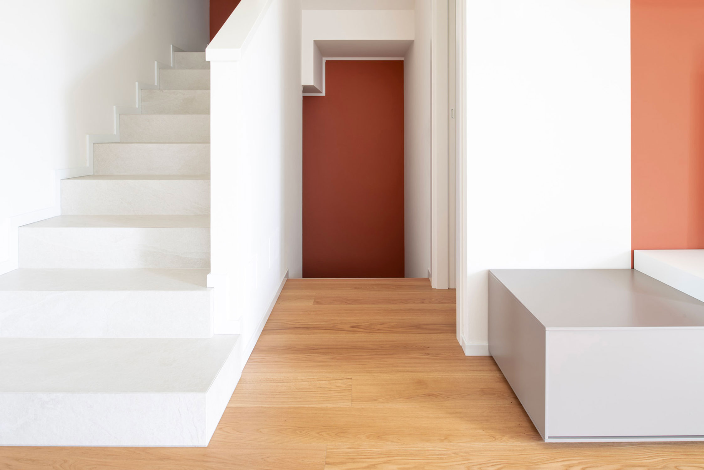 Un progetto che vive di contrasti controllati: materiali, colori e geometrie si sovrappongono creando un racconto coerente. La zona giorno ruota attorno a una quinta attrezzata che accoglie la sala da pranzo, con arredi sospesi terracotta in dialogo con lo sfondo tortora.