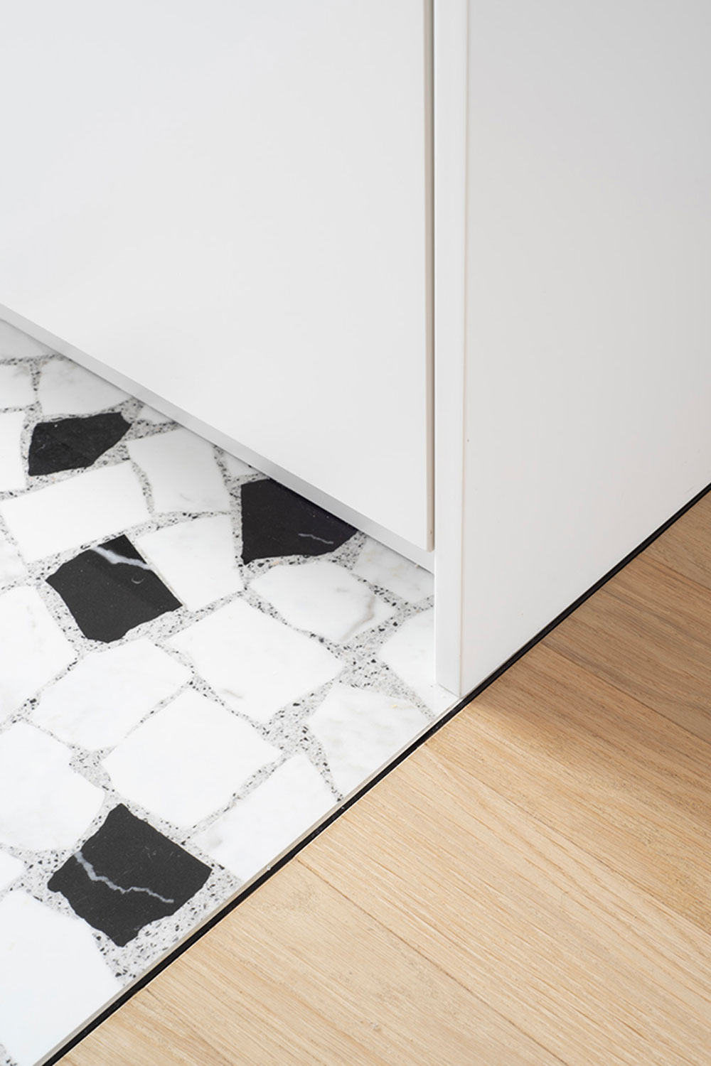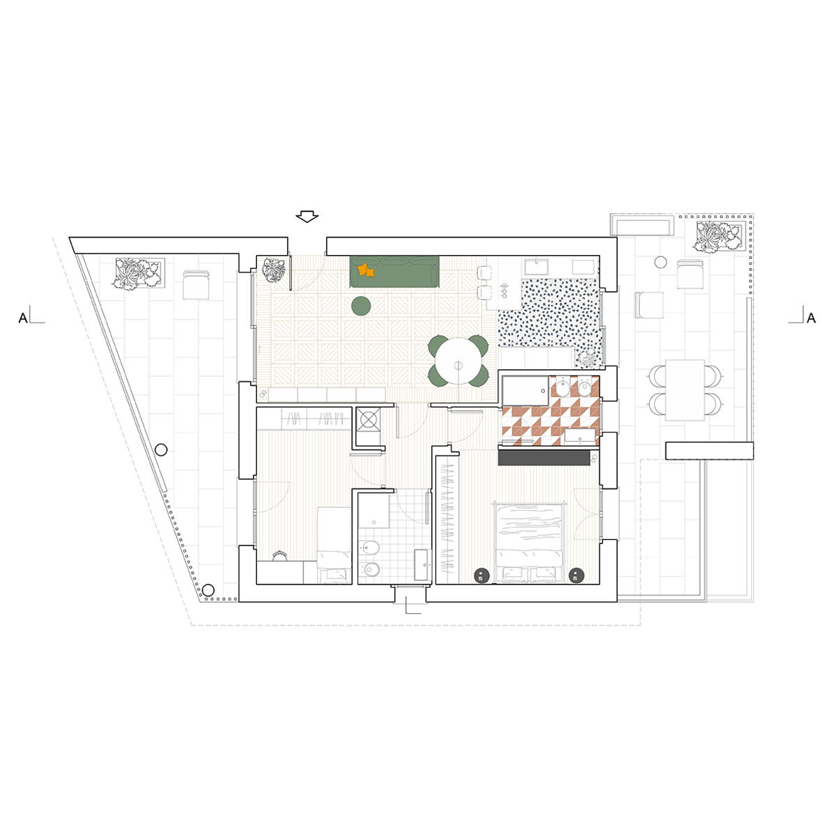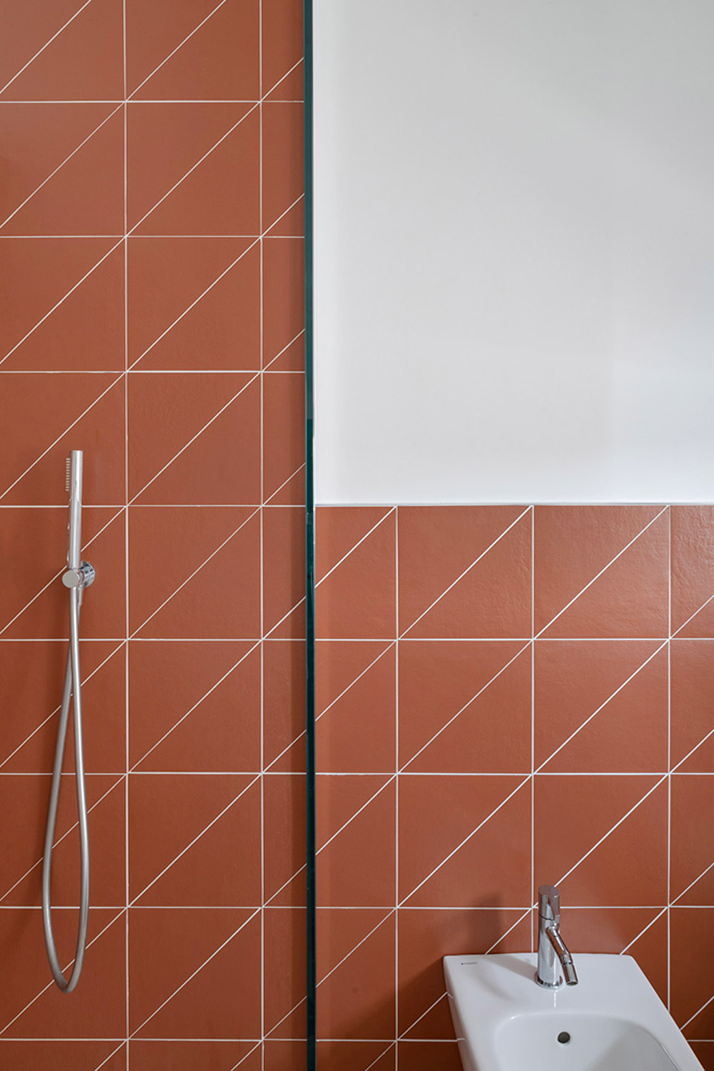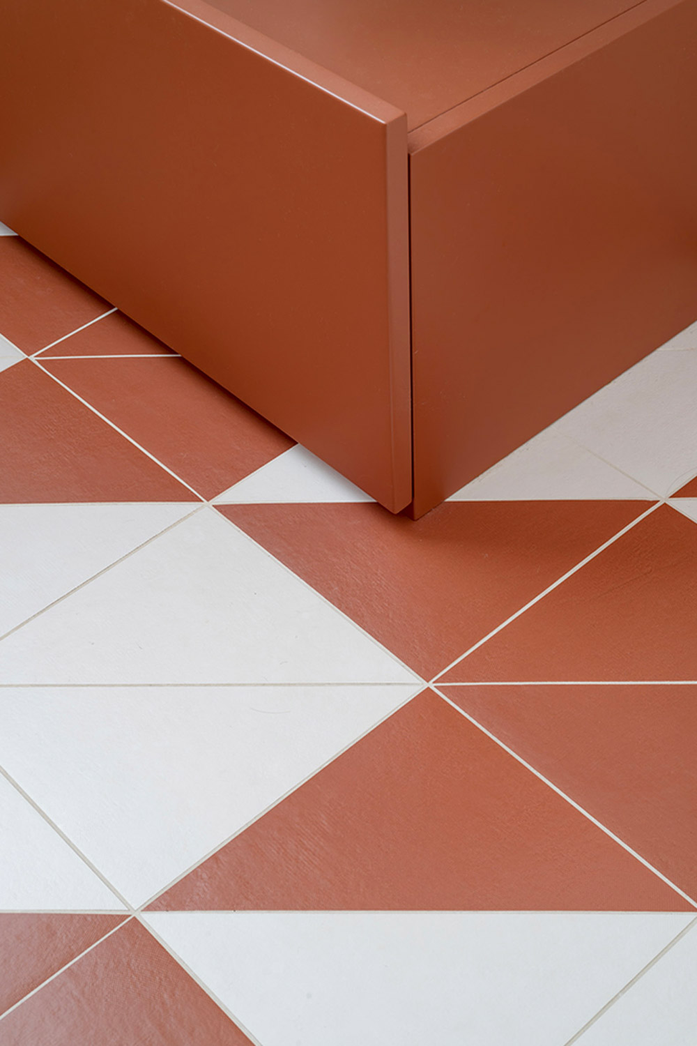 Il soggiorno ruota attorno a un parquet a quadrotte disegnato su misura, concepito come tappeto architettonico; in contrapposizione, la zona cottura adotta una pavimentazione specchiante effetto palladiana che amplifica la luce. La cucina combina ferro verniciato terracotta e legno laccato bianco, trovando equilibrio nel dialogo dei materiali. La camera matrimoniale privilegia calore e ordine, mentre i due bagni interpretano il tema del contrasto con disegni geometrici e palette complementari.