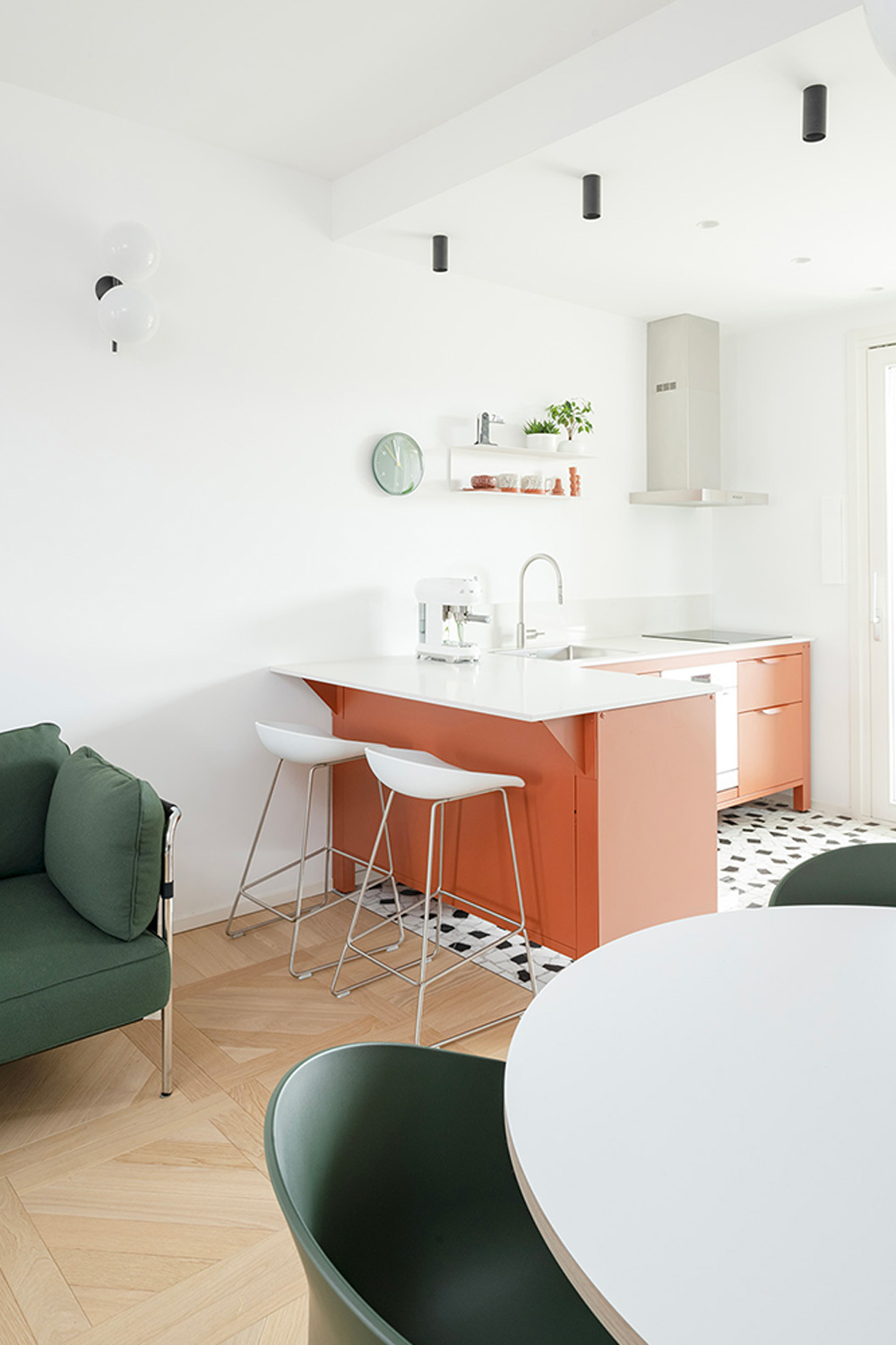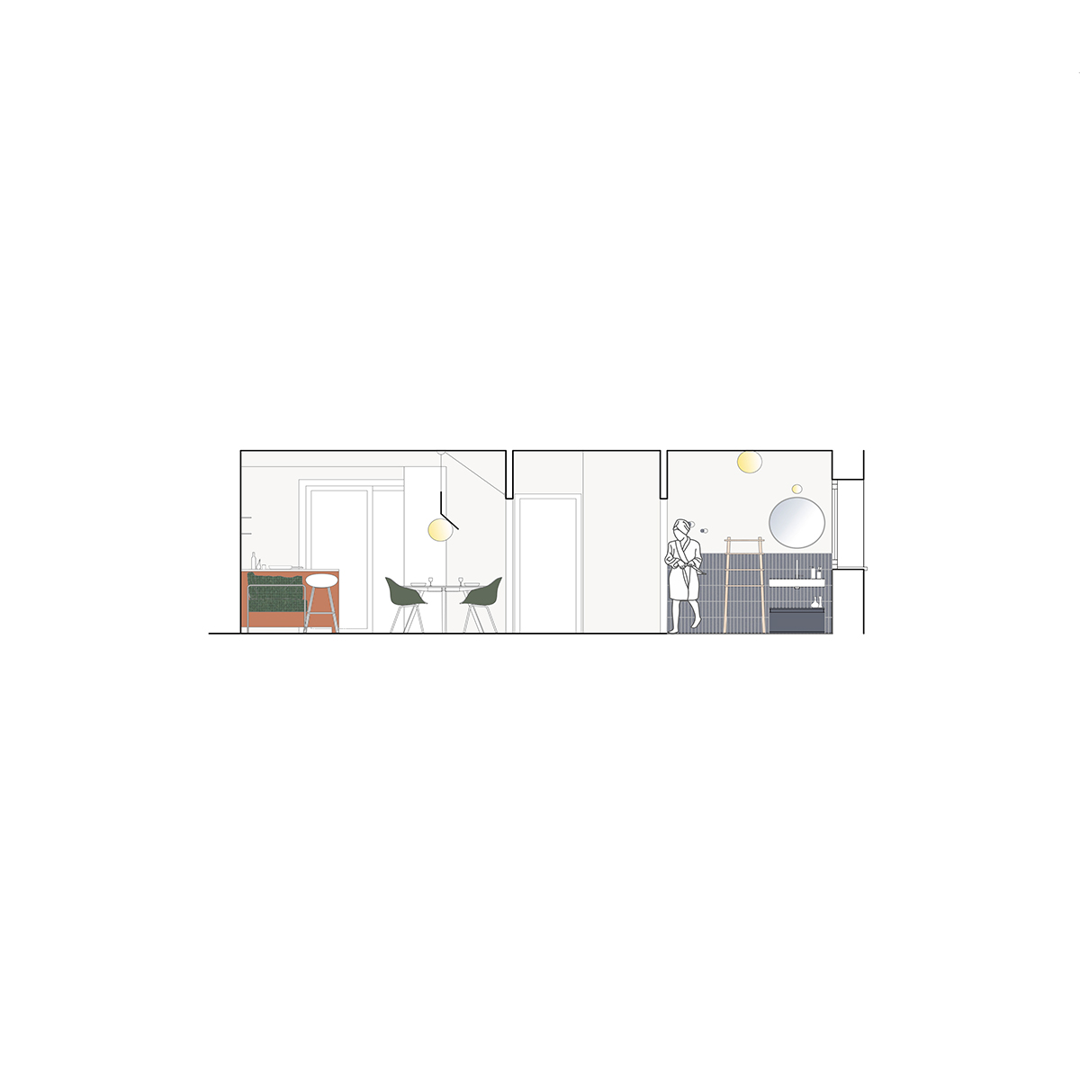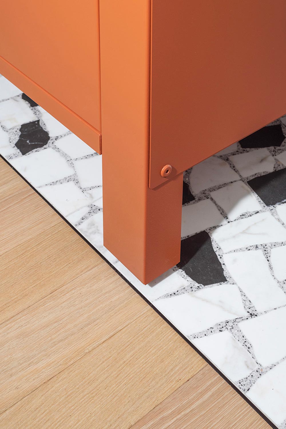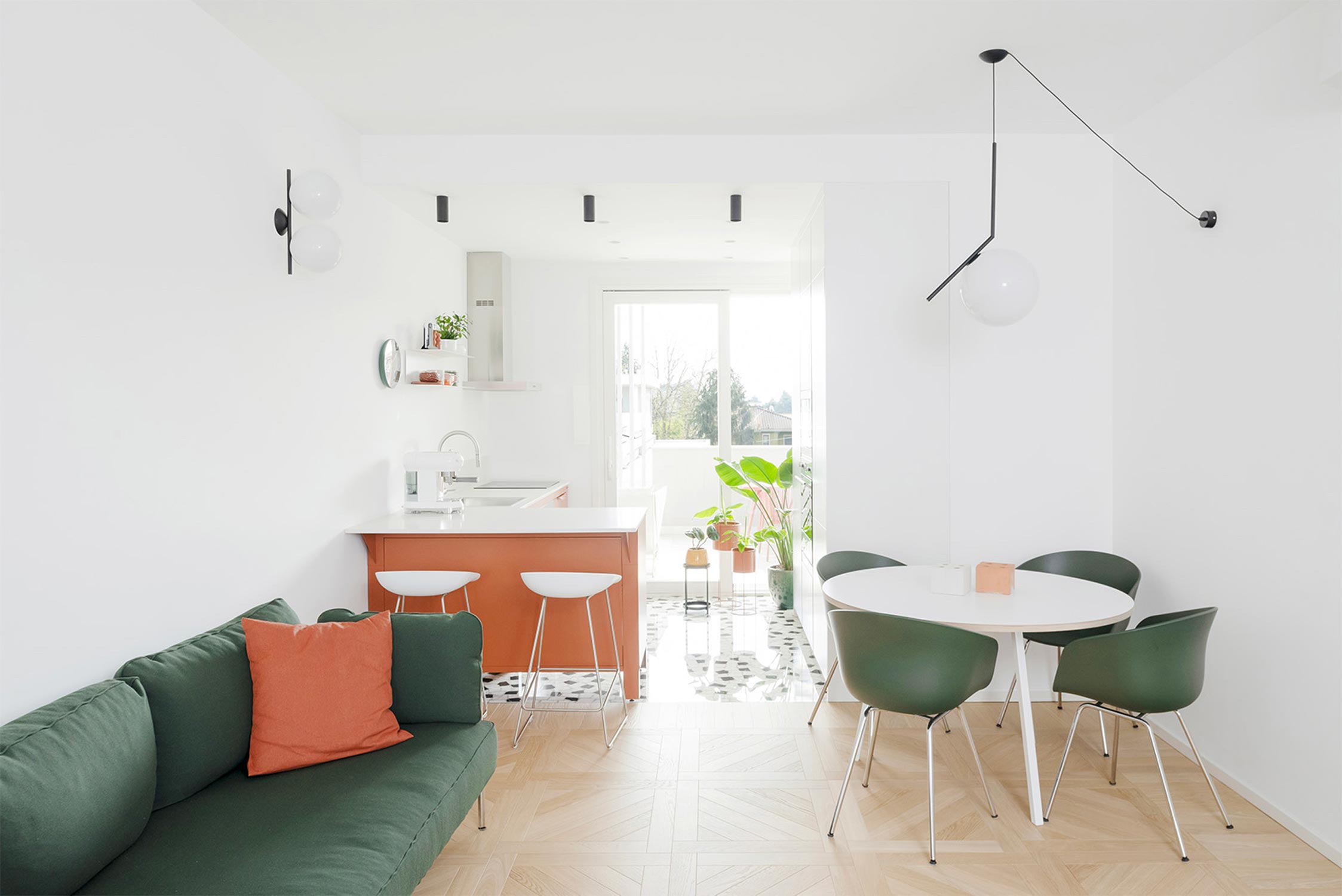 Il soggiorno ruota attorno a un parquet a quadrotte disegnato su misura, concepito come tappeto architettonico; in contrapposizione, la zona cottura adotta una pavimentazione specchiante effetto palladiana che amplifica la luce. La cucina combina ferro verniciato terracotta e legno laccato bianco, trovando equilibrio nel dialogo dei materiali. La camera matrimoniale privilegia calore e ordine, mentre i due bagni interpretano il tema del contrasto con disegni geometrici e palette complementari.
