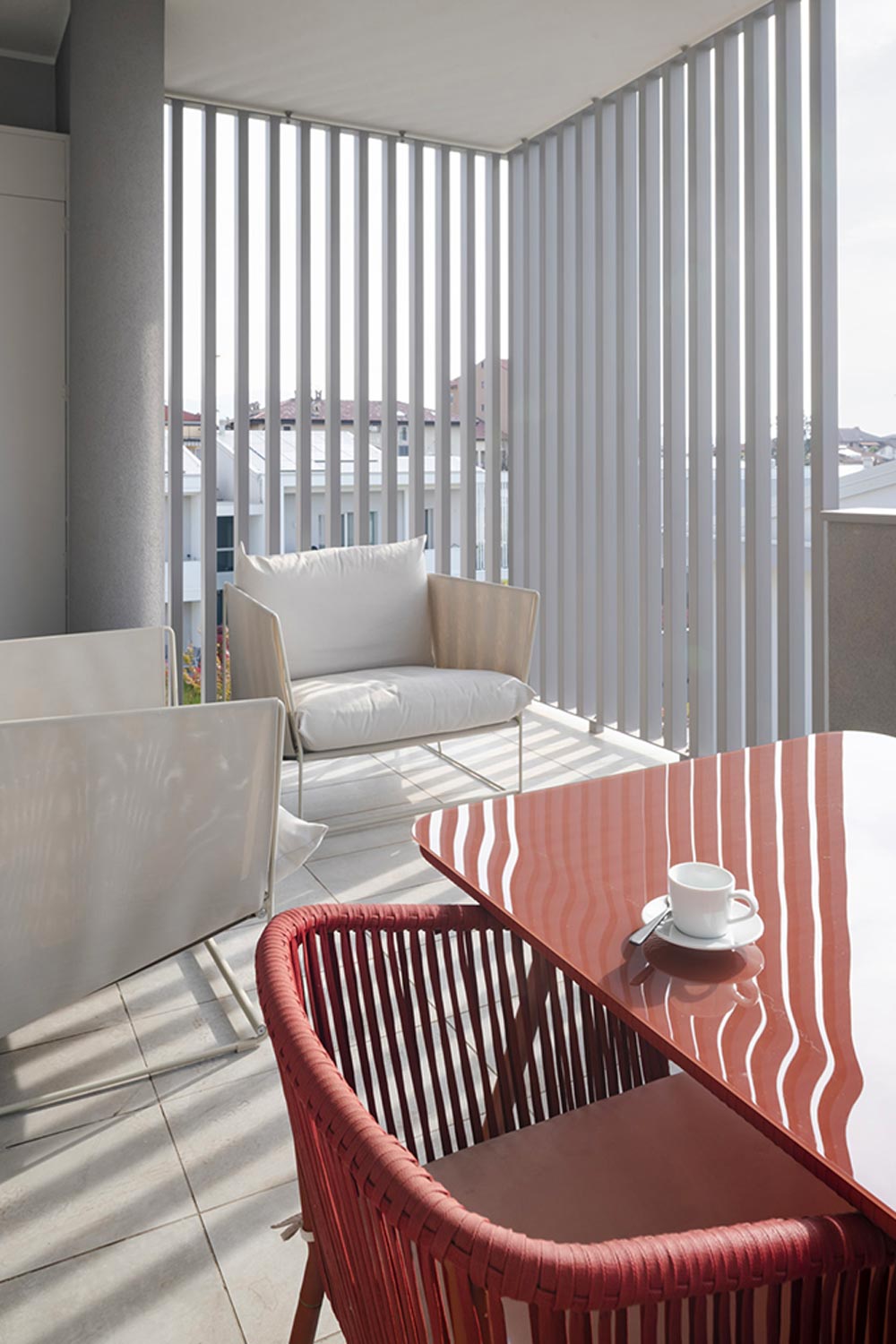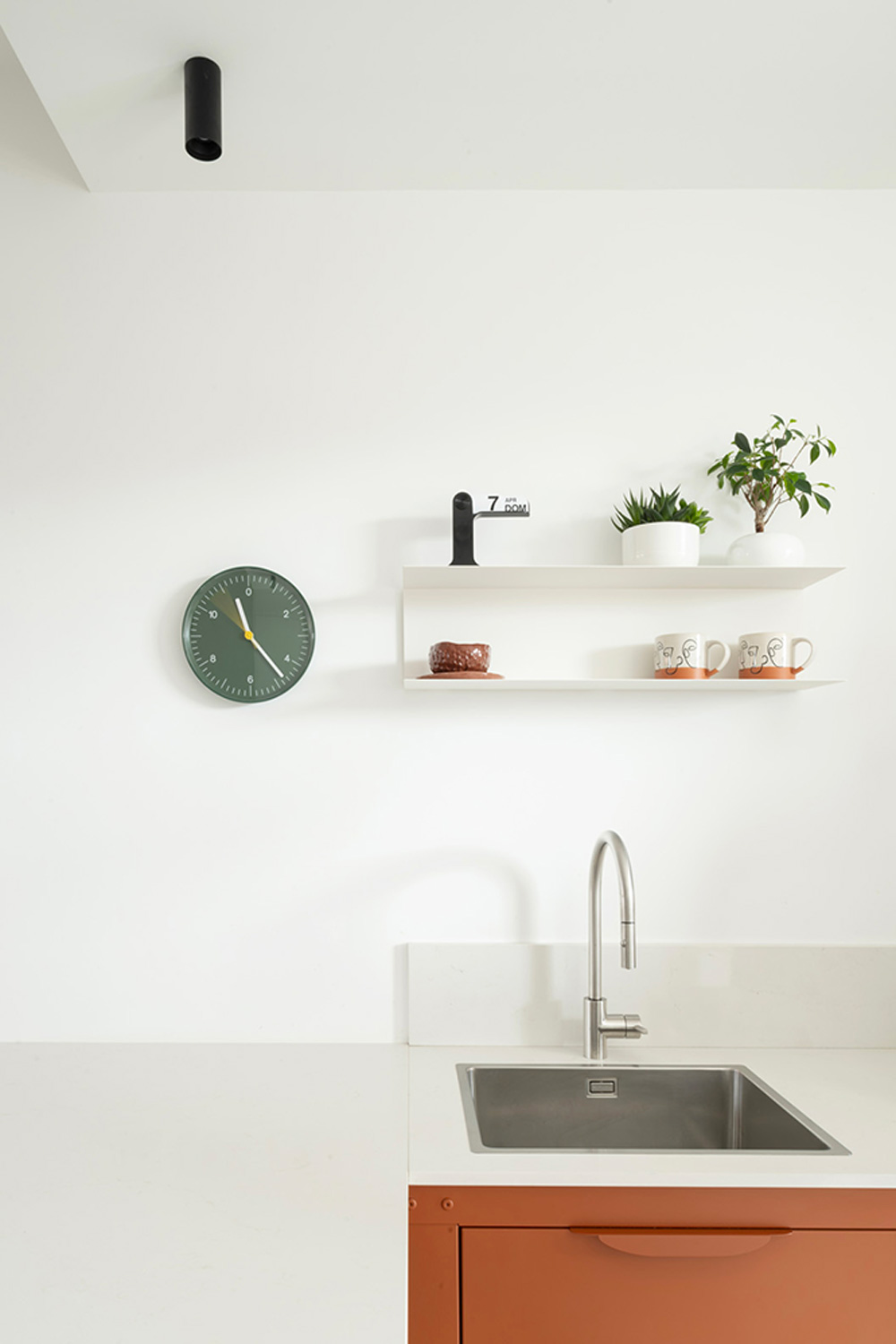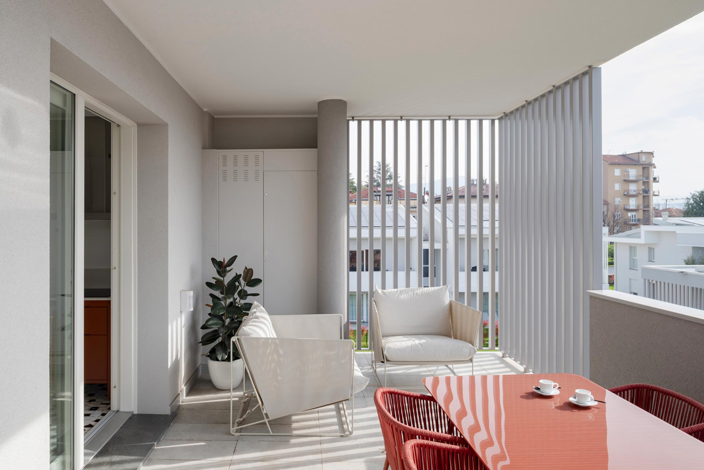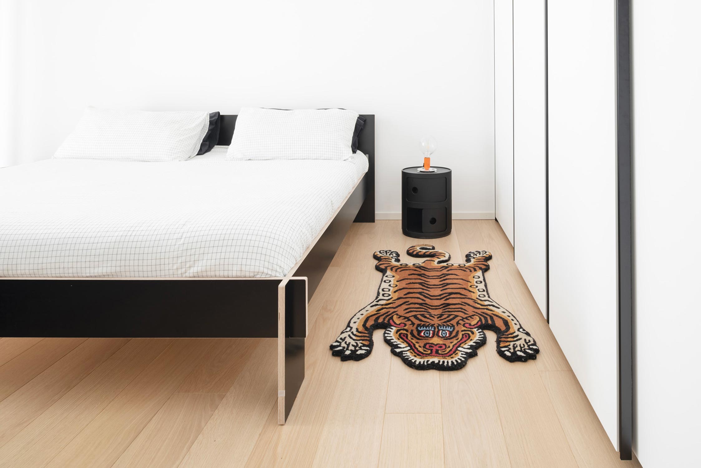 Il soggiorno ruota attorno a un parquet a quadrotte disegnato su misura, concepito come tappeto architettonico; in contrapposizione, la zona cottura adotta una pavimentazione specchiante effetto palladiana che amplifica la luce. La cucina combina ferro verniciato terracotta e legno laccato bianco, trovando equilibrio nel dialogo dei materiali. La camera matrimoniale privilegia calore e ordine, mentre i due bagni interpretano il tema del contrasto con disegni geometrici e palette complementari.
