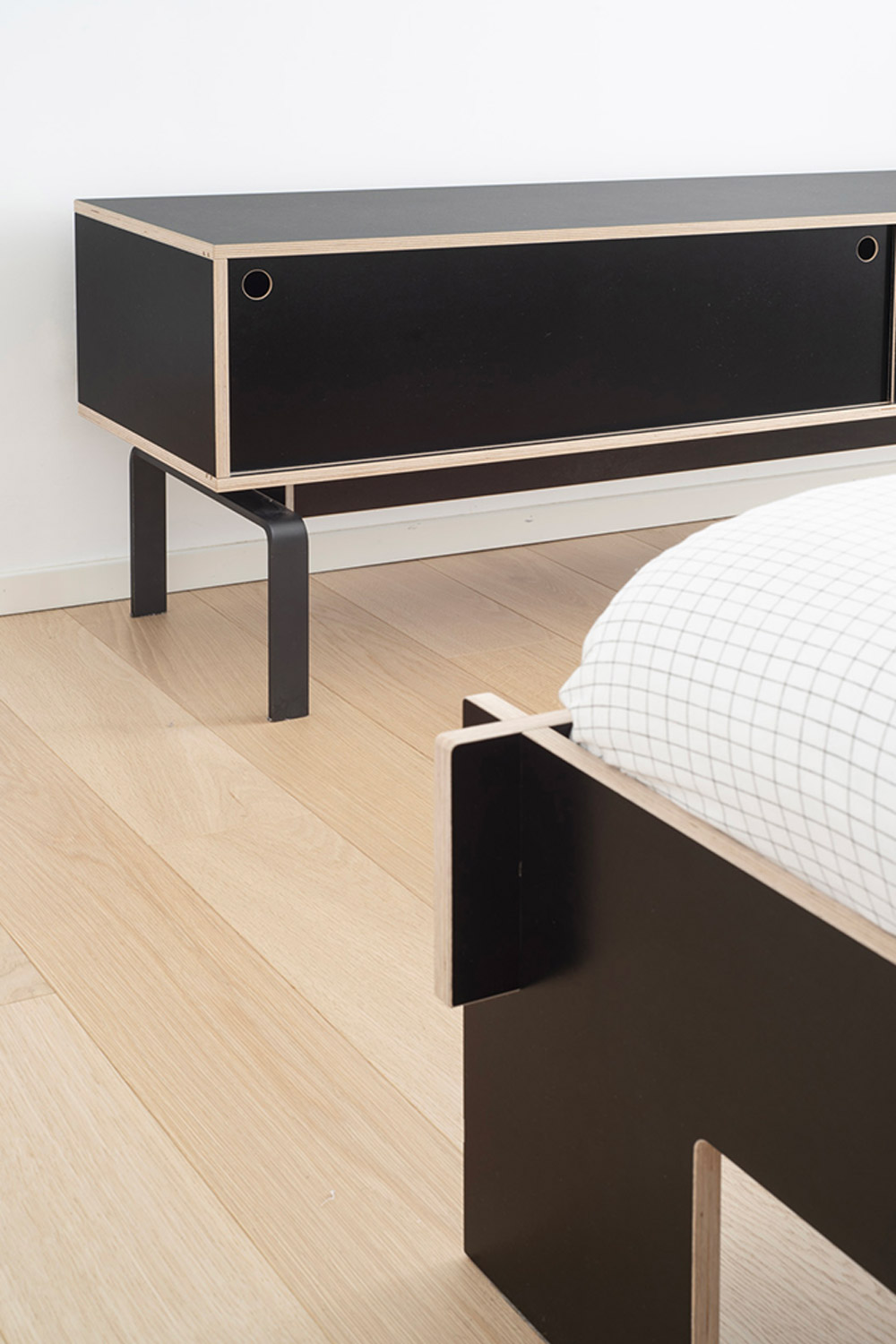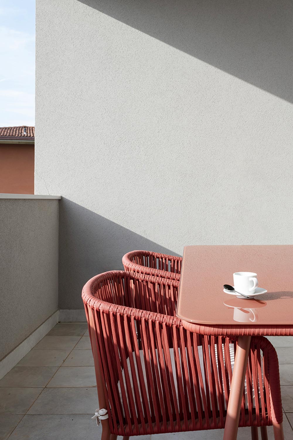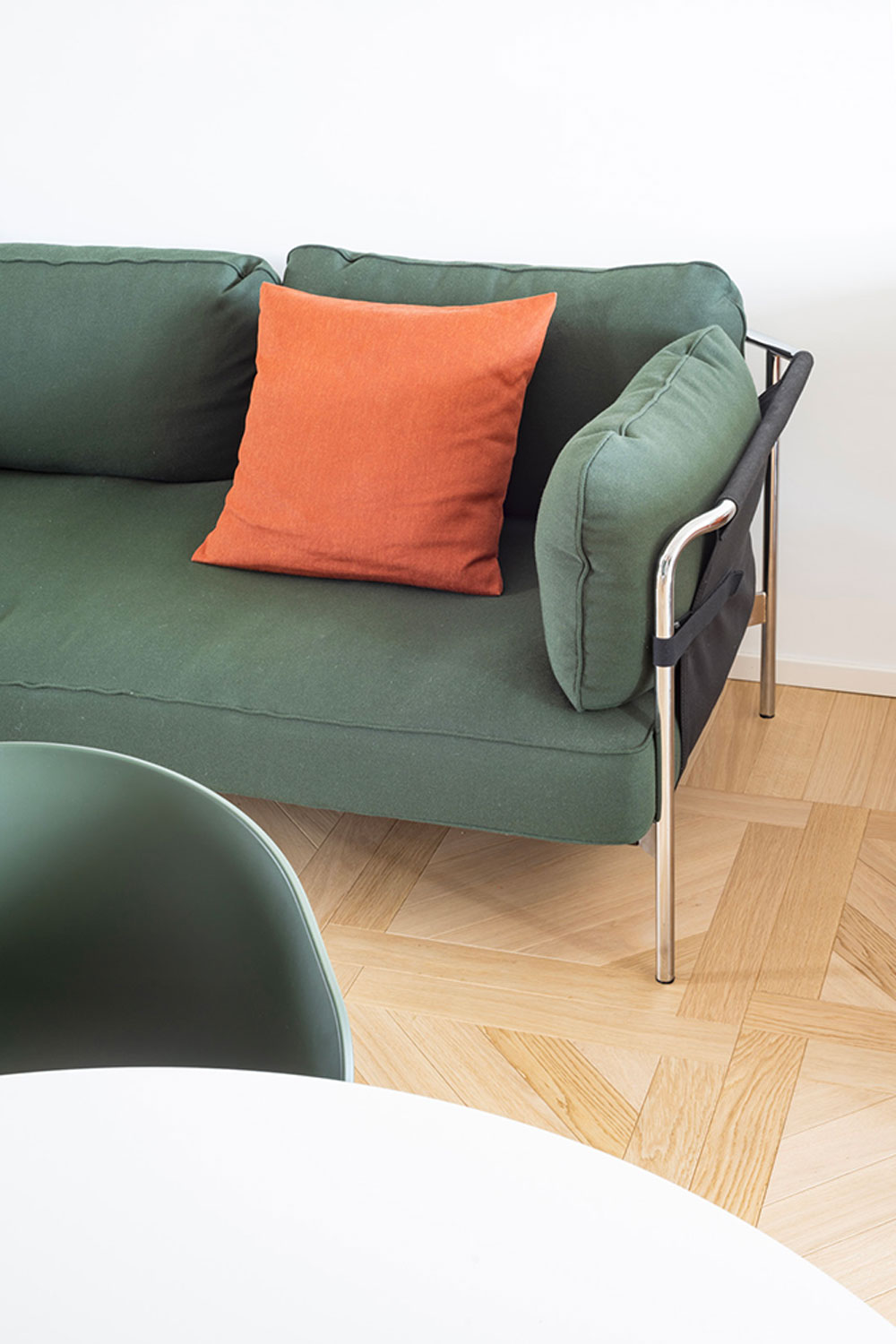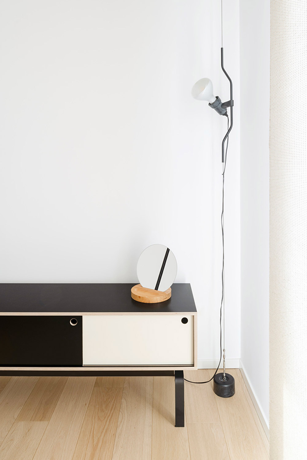 Il soggiorno ruota attorno a un parquet a quadrotte disegnato su misura, concepito come tappeto architettonico; in contrapposizione, la zona cottura adotta una pavimentazione specchiante effetto palladiana che amplifica la luce. La cucina combina ferro verniciato terracotta e legno laccato bianco, trovando equilibrio nel dialogo dei materiali. La camera matrimoniale privilegia calore e ordine, mentre i due bagni interpretano il tema del contrasto con disegni geometrici e palette complementari.