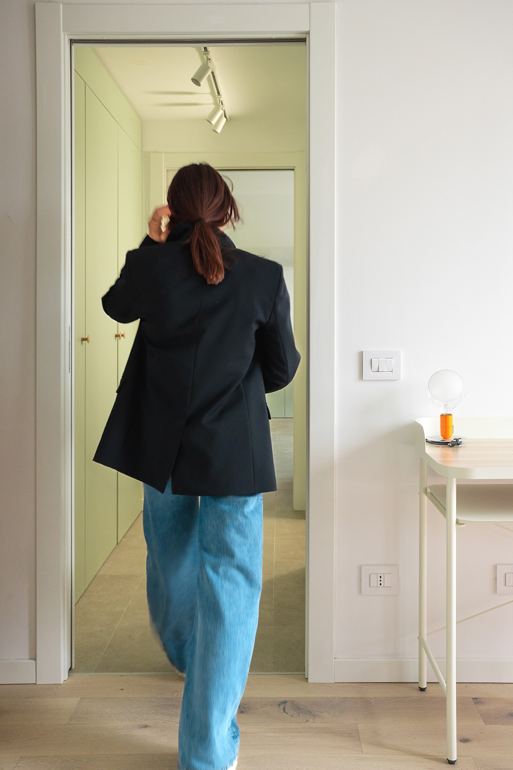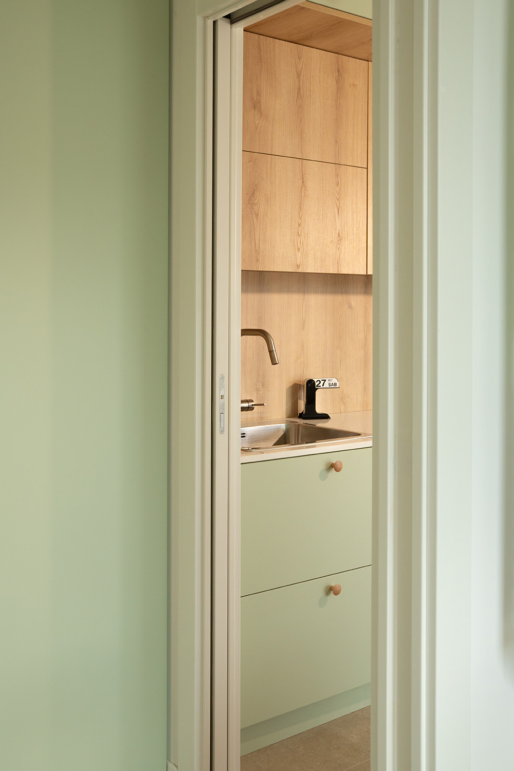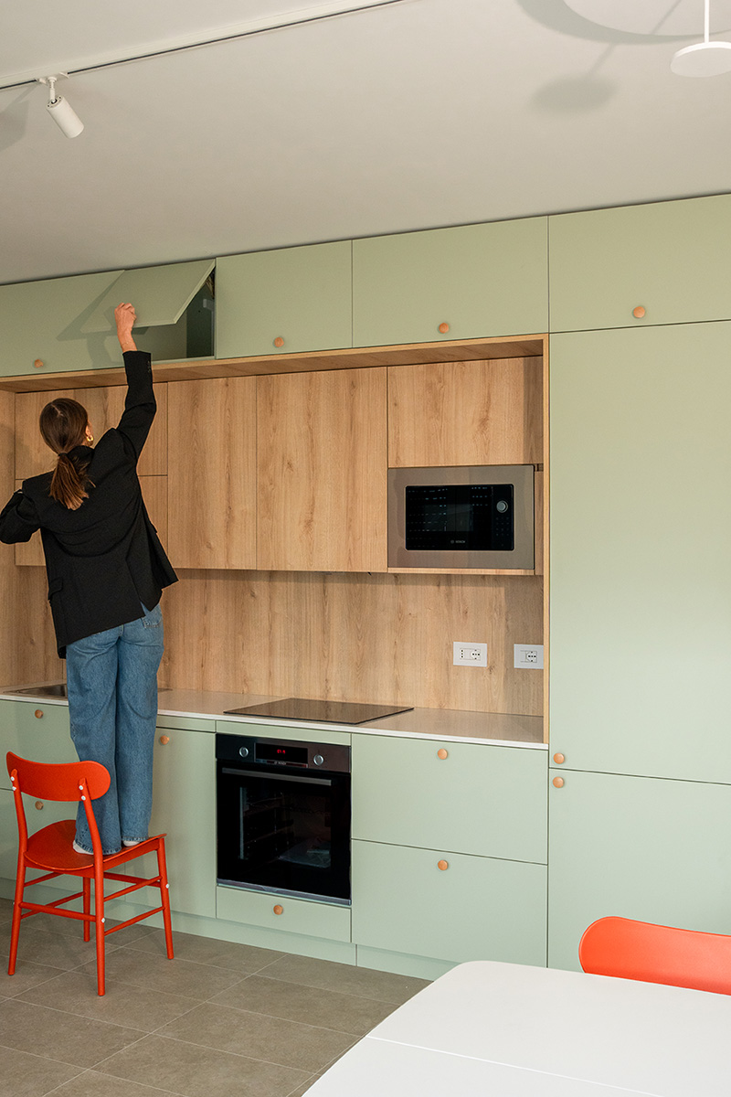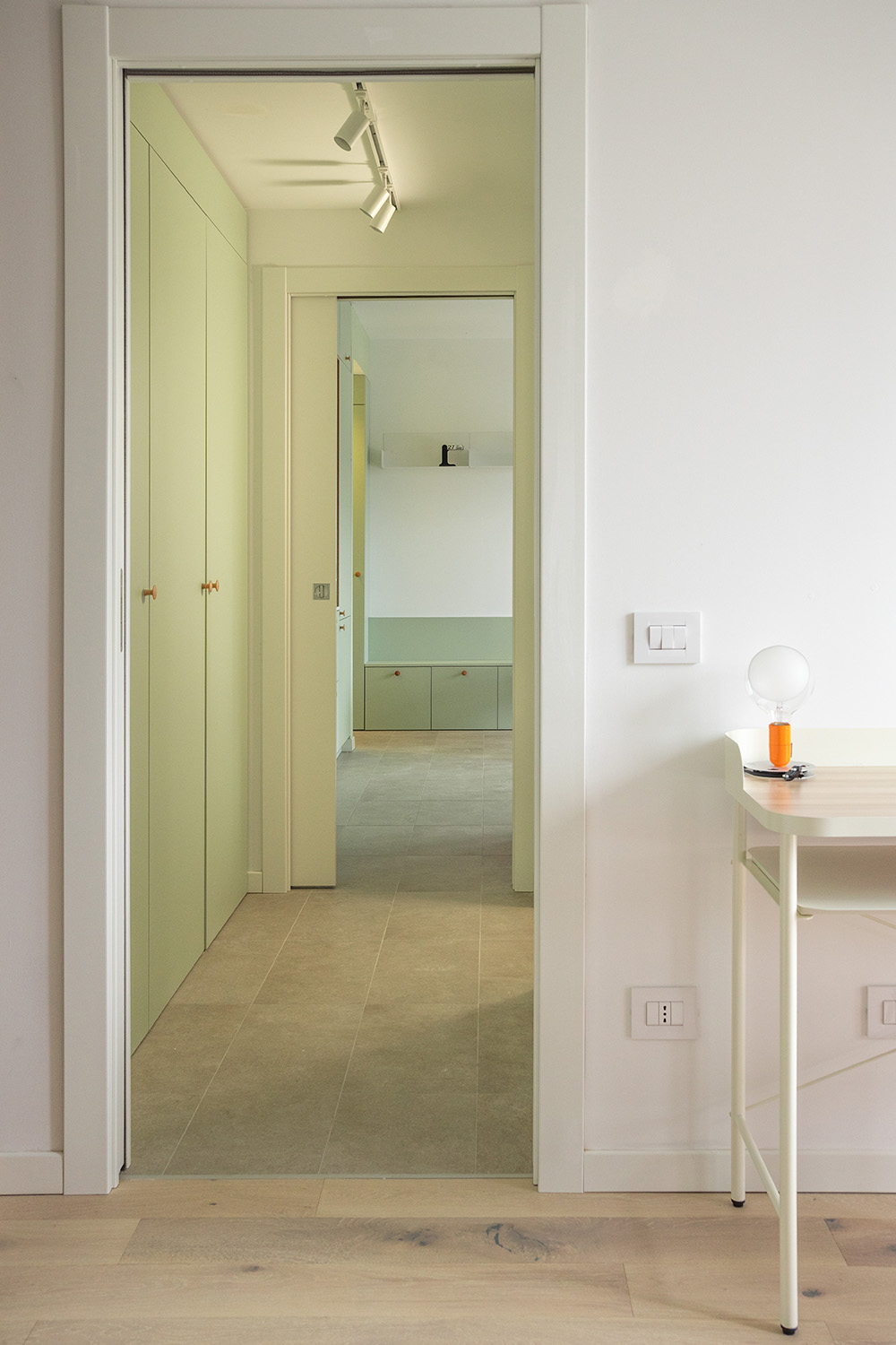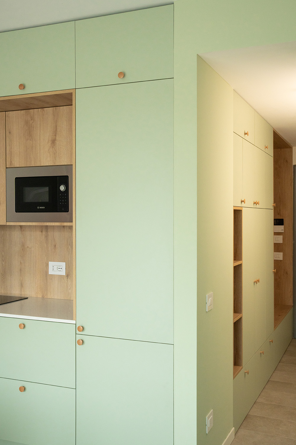 VG6 è un bilocale di 50 mq organizzato attorno a un volume unitario in verde salvia (NCS S 1010-G10Y) che, dalla porta d’ingresso, si trasforma fluidamente da guardaroba a cucina fino alla lavanderia.