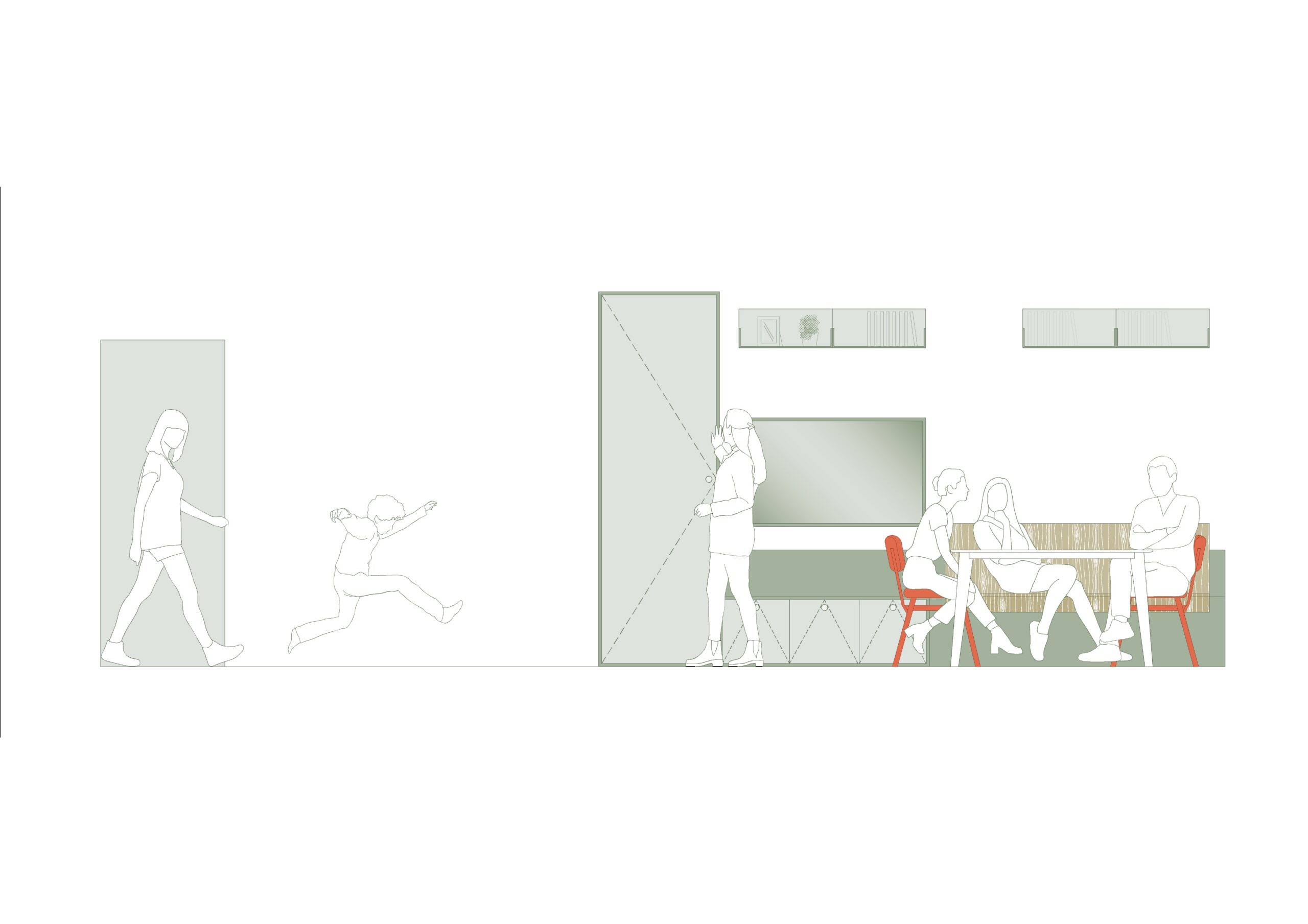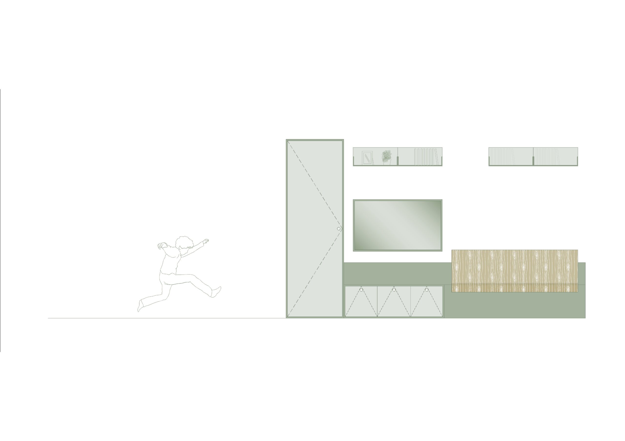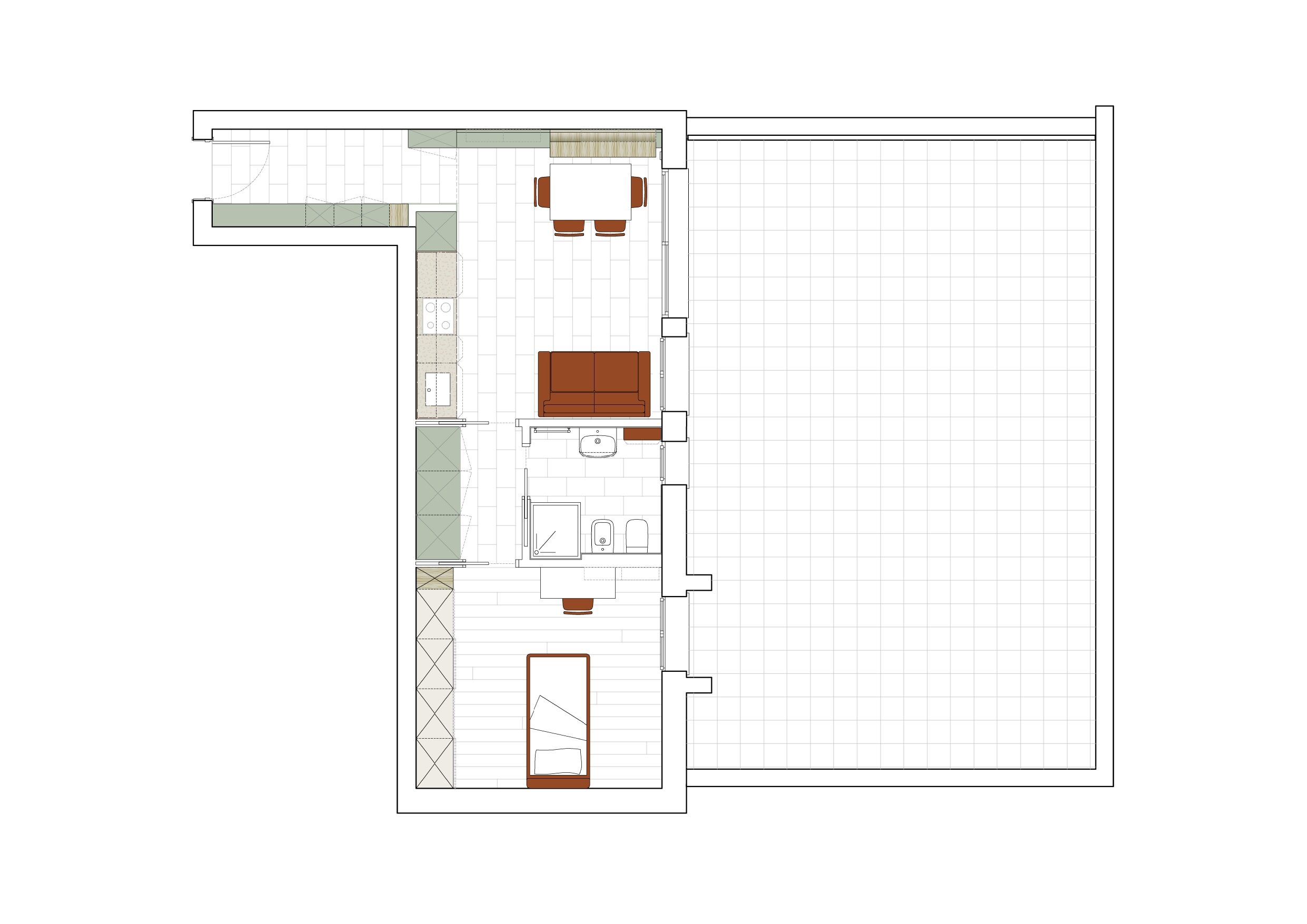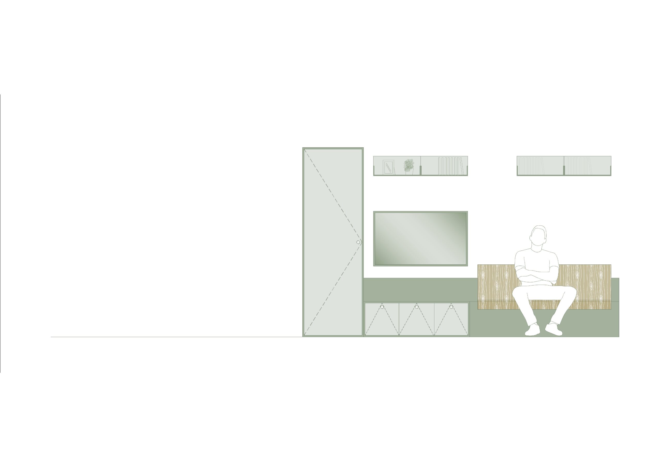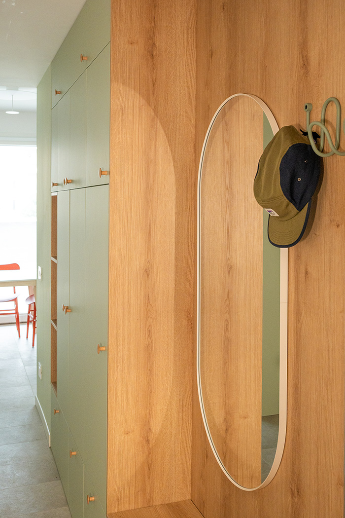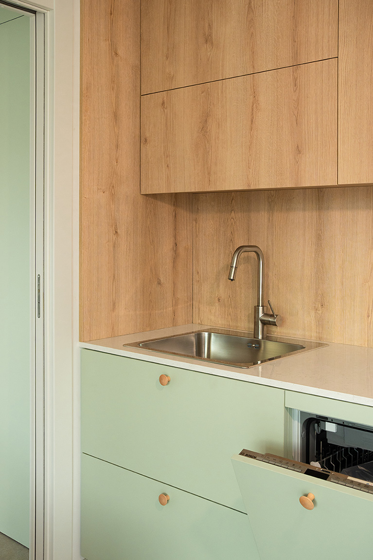 VG6 è un bilocale di 50 mq organizzato attorno a un volume unitario in verde salvia (NCS S 1010-G10Y) che, dalla porta d’ingresso, si trasforma fluidamente da guardaroba a cucina fino alla lavanderia.