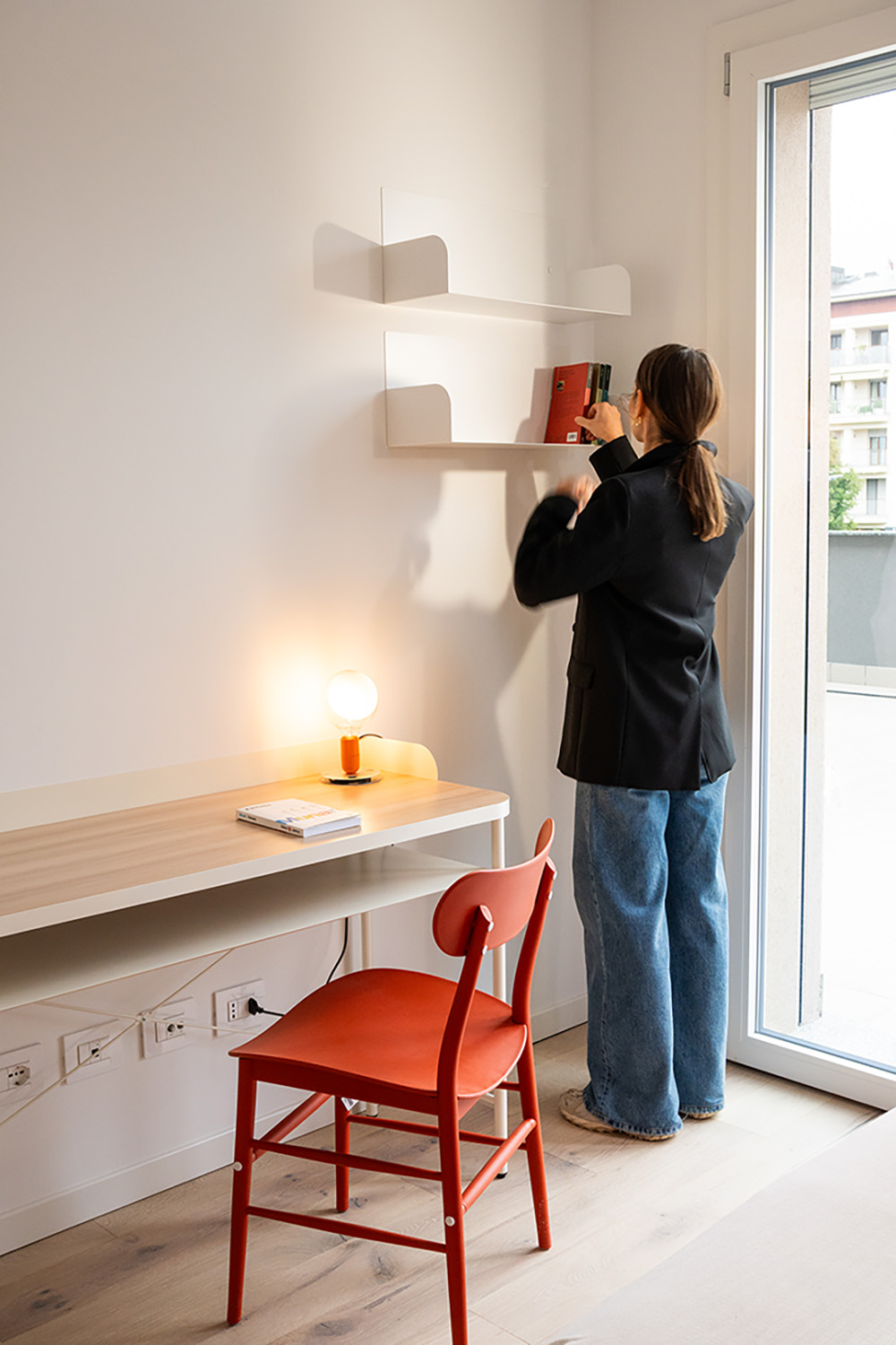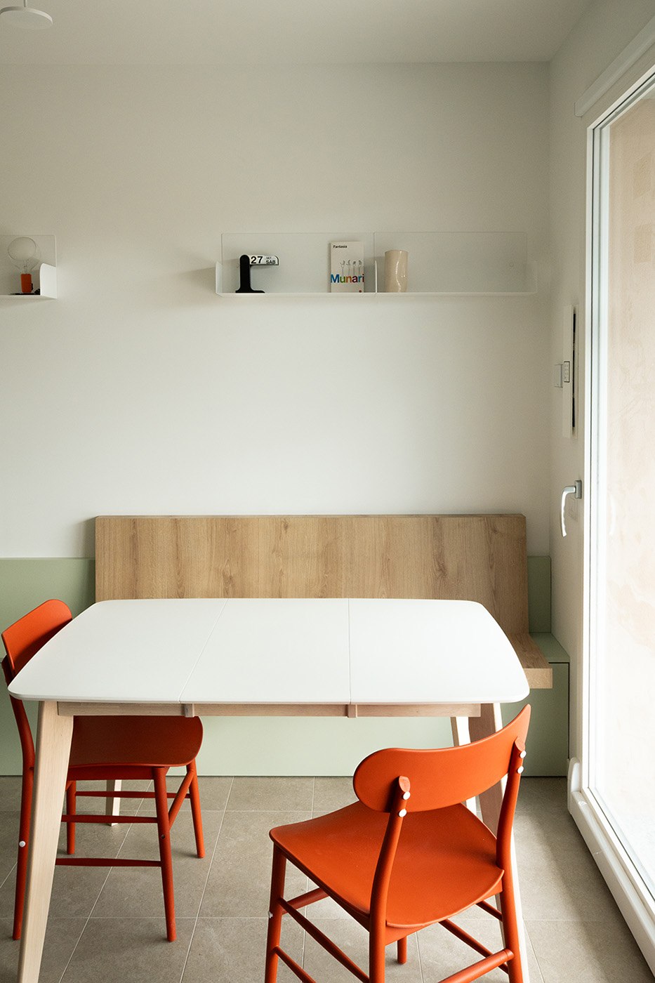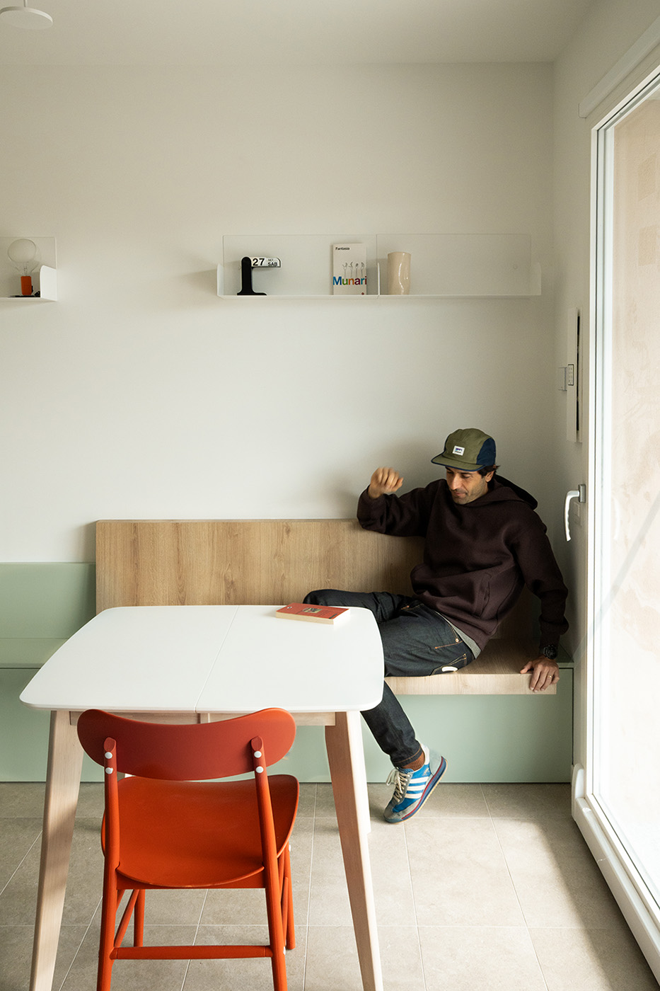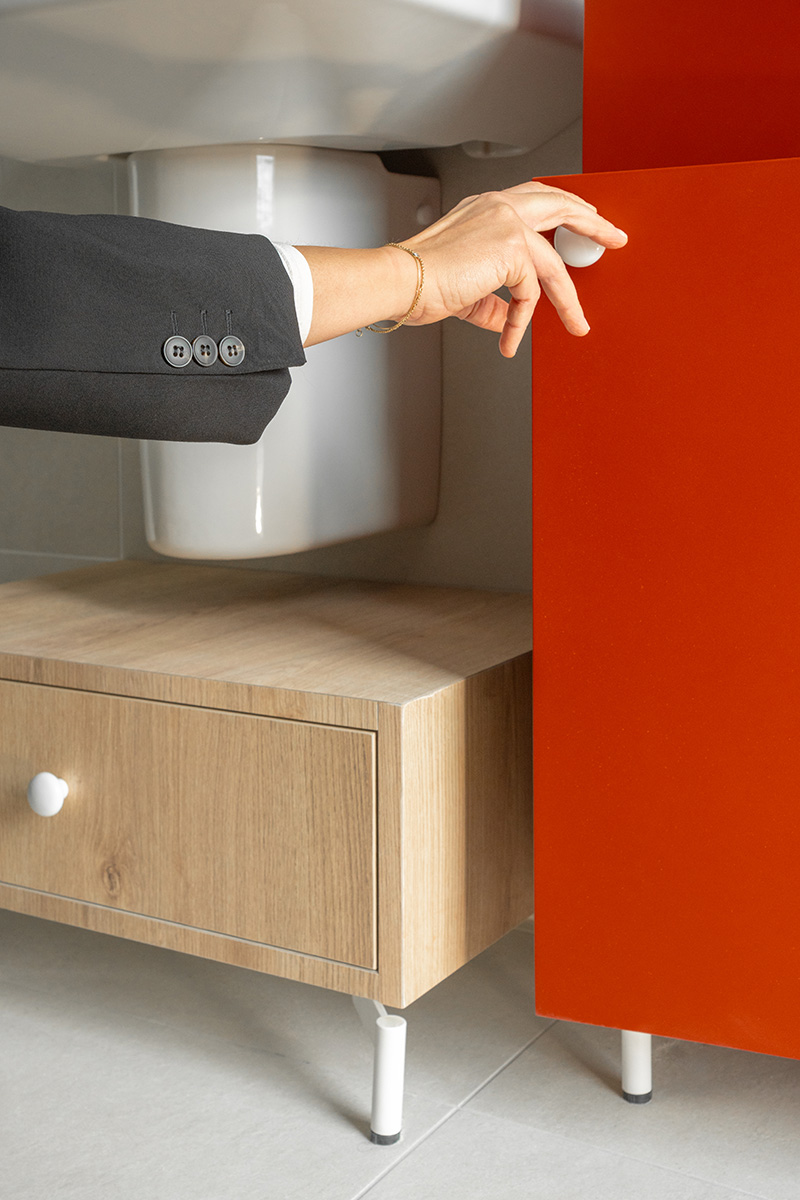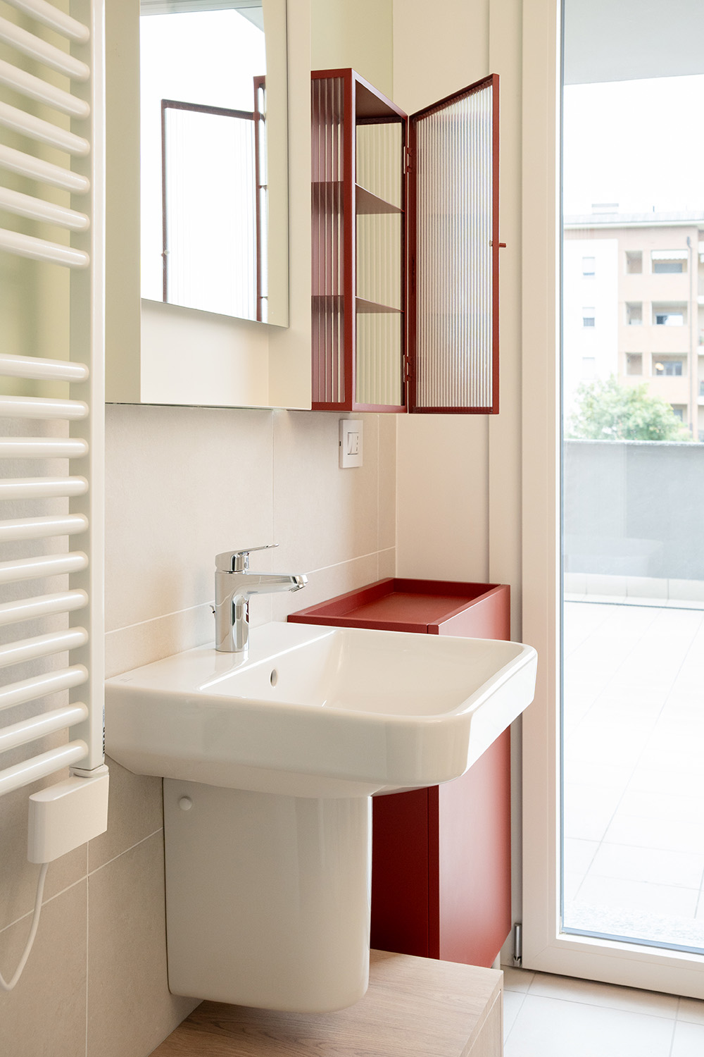 Gli scavi in rovere naturale definiscono la nicchia d’ingresso e l’area operativa della cucina, mentre il rovere ritorna nei pomoli e nella banquette sagomata appoggiata su una base con cassettoni estraibili, fulcro multifunzionale della zona giorno. Nel bagno il rosso caratterizza un elemento sospeso in vetro cannettato e un mobile su piedini con cassetto nascosto, completato da un cassettone in rovere sotto il lavabo. Ogni dettaglio è disegnato al millimetro.