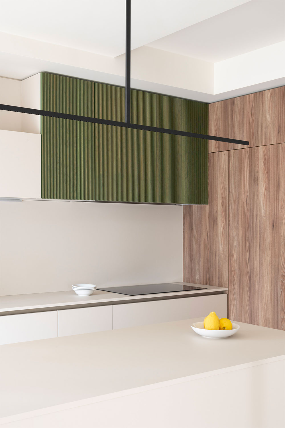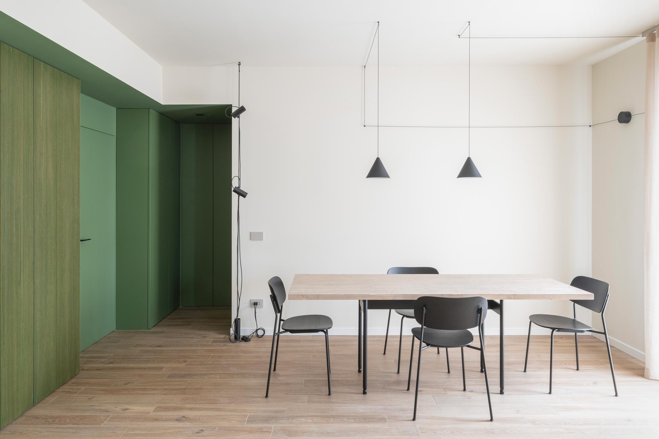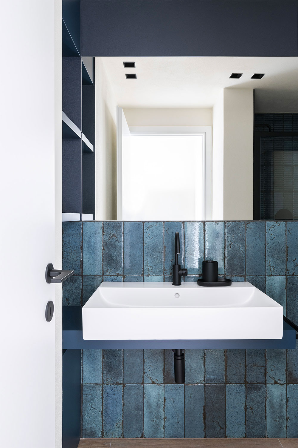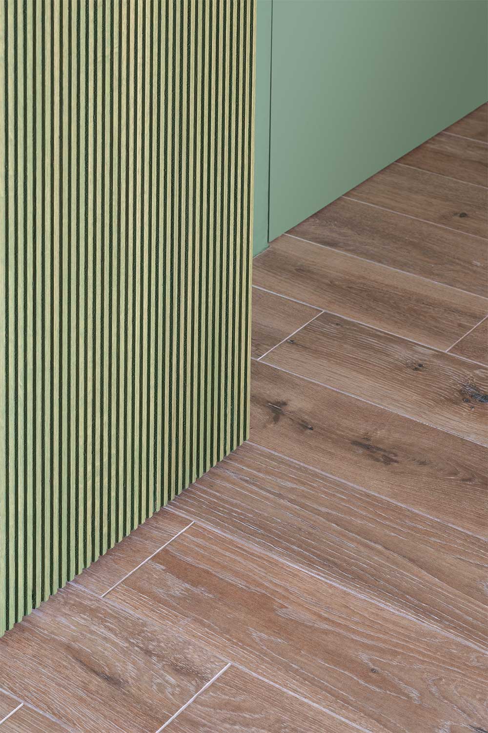 Linee regolari, geometrie semplici e arredi su misura costruiscono un ambiente fluido in cui cucina, pranzo e soggiorno dialogano attraverso ribassamenti che definiscono le funzioni senza interrompere la percezione dello spazio. Il verde, colore simbolico dei committenti, si combina con noce e champagne, creando un linguaggio caldo e ordinato. La cucina su misura integra colonne in noce, dettagli cannettati e un’isola centrale come fulcro. Nella zona notte, toni più scuri e texture tessili costruiscono un’atmosfera intima. Il bagno ospiti è avvolto in un blu intenso che richiama l’acqua, con rivestimento lucido e irregolare che riflette la luce, mobili su misura e pareti in tinta. Il bagno padronale interpreta il tema naturale attraverso un gres moka con texture che ricorda il lino, abbinato ad arredi in legno e a nicchie ricavate nel volume doccia.