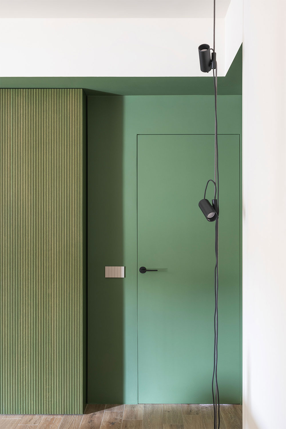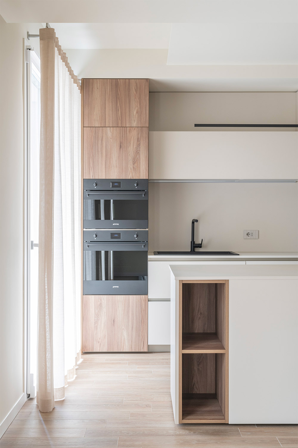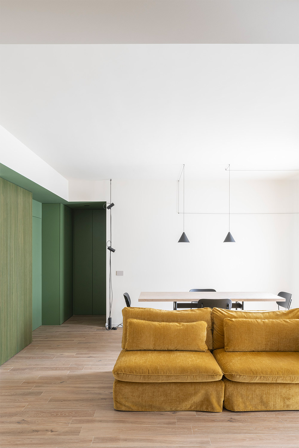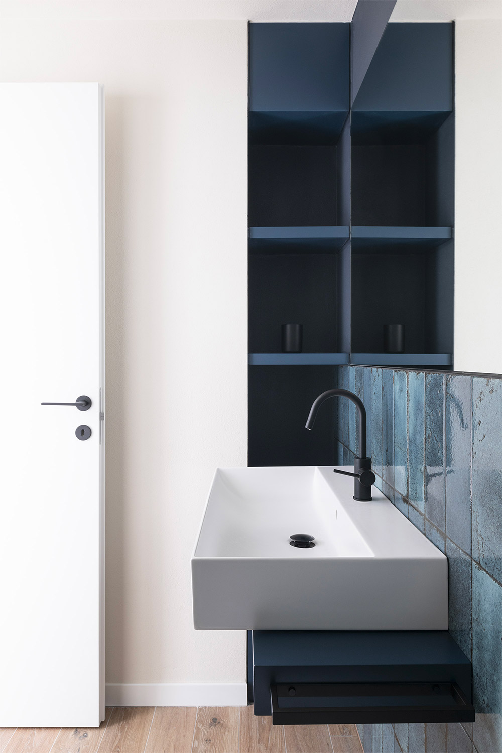 Linee regolari, geometrie semplici e arredi su misura costruiscono un ambiente fluido in cui cucina, pranzo e soggiorno dialogano attraverso ribassamenti che definiscono le funzioni senza interrompere la percezione dello spazio. Il verde, colore simbolico dei committenti, si combina con noce e champagne, creando un linguaggio caldo e ordinato. La cucina su misura integra colonne in noce, dettagli cannettati e un’isola centrale come fulcro. Nella zona notte, toni più scuri e texture tessili costruiscono un’atmosfera intima. Il bagno ospiti è avvolto in un blu intenso che richiama l’acqua, con rivestimento lucido e irregolare che riflette la luce, mobili su misura e pareti in tinta. Il bagno padronale interpreta il tema naturale attraverso un gres moka con texture che ricorda il lino, abbinato ad arredi in legno e a nicchie ricavate nel volume doccia.