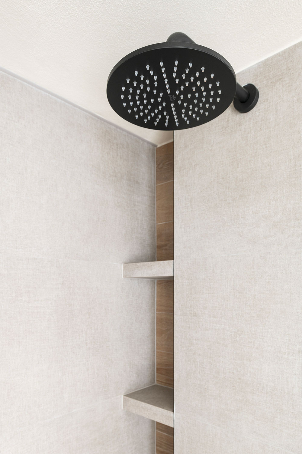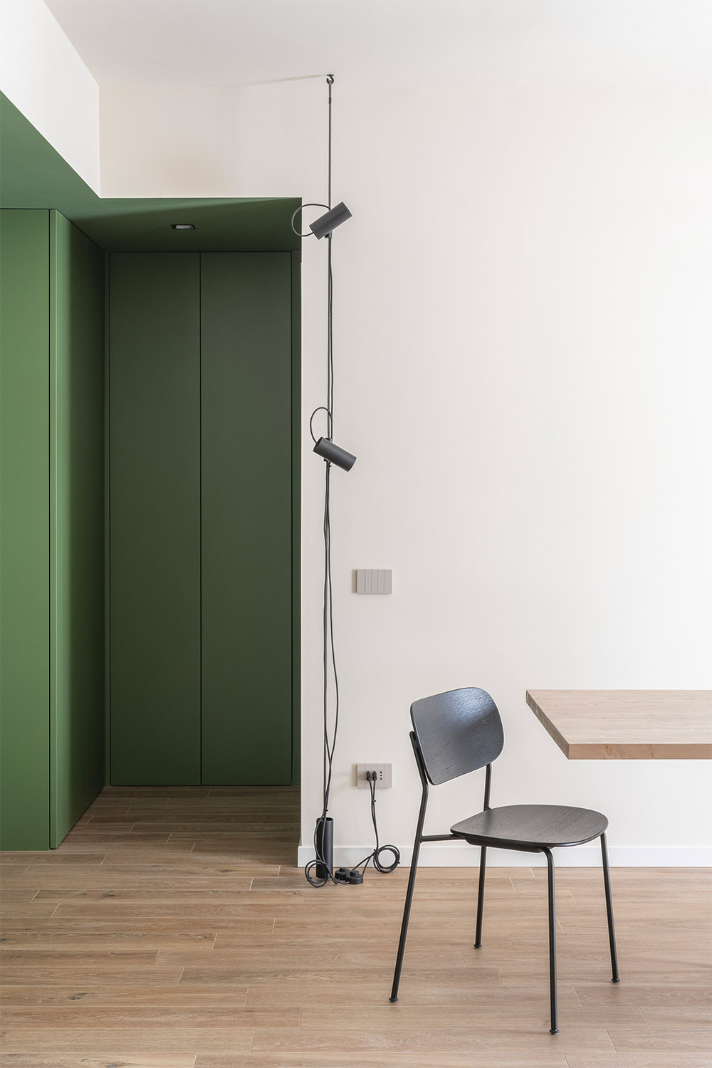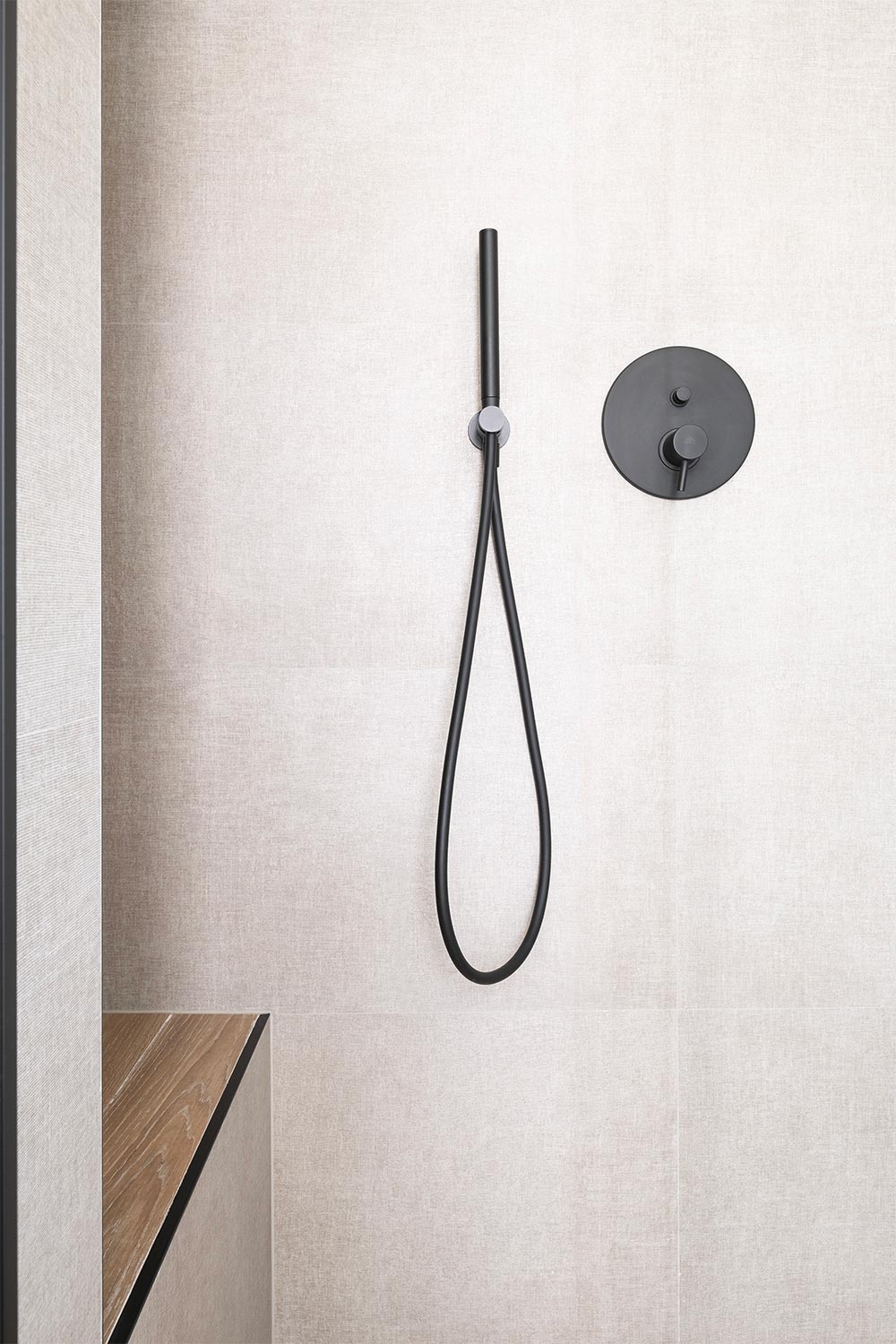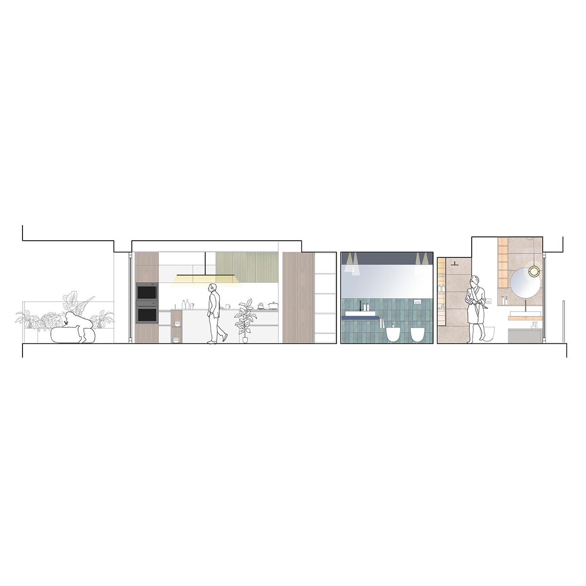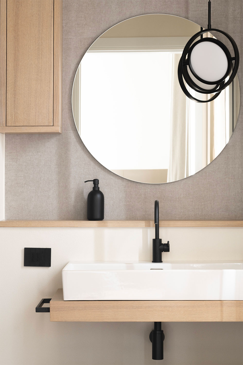 Linee regolari, geometrie semplici e arredi su misura costruiscono un ambiente fluido in cui cucina, pranzo e soggiorno dialogano attraverso ribassamenti che definiscono le funzioni senza interrompere la percezione dello spazio. Il verde, colore simbolico dei committenti, si combina con noce e champagne, creando un linguaggio caldo e ordinato. La cucina su misura integra colonne in noce, dettagli cannettati e un’isola centrale come fulcro. Nella zona notte, toni più scuri e texture tessili costruiscono un’atmosfera intima. Il bagno ospiti è avvolto in un blu intenso che richiama l’acqua, con rivestimento lucido e irregolare che riflette la luce, mobili su misura e pareti in tinta. Il bagno padronale interpreta il tema naturale attraverso un gres moka con texture che ricorda il lino, abbinato ad arredi in legno e a nicchie ricavate nel volume doccia.