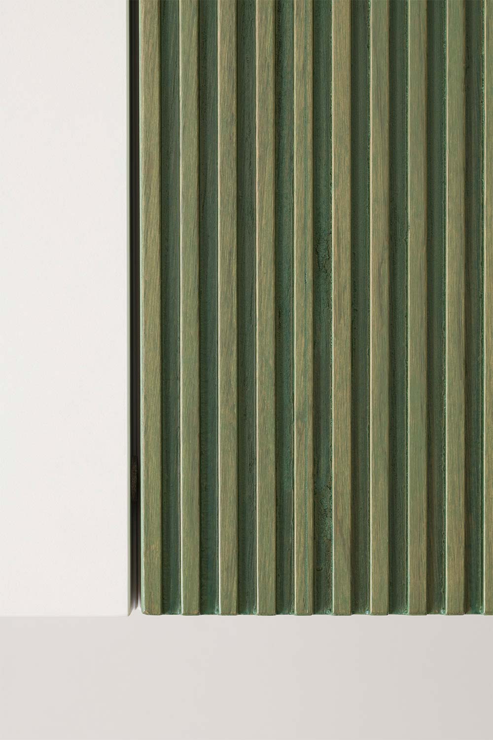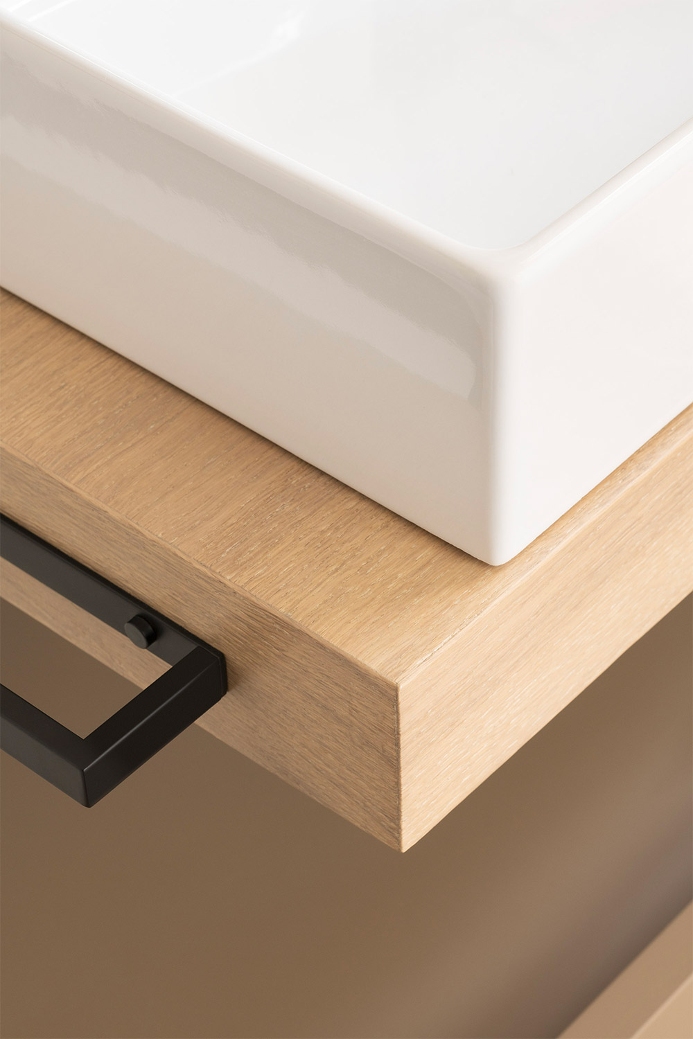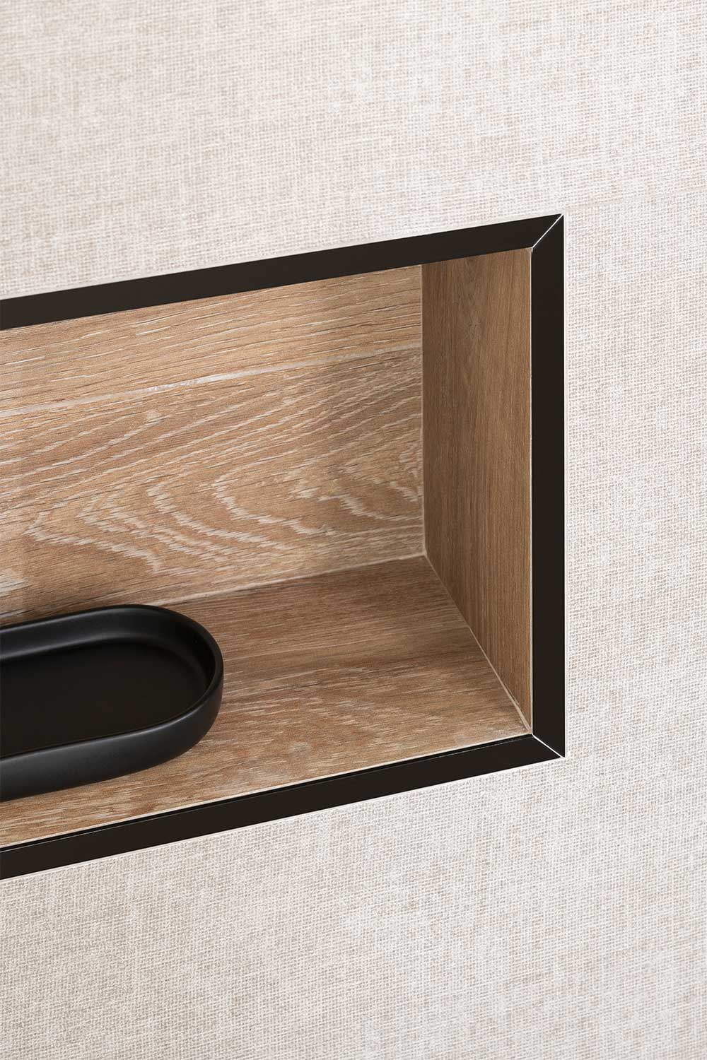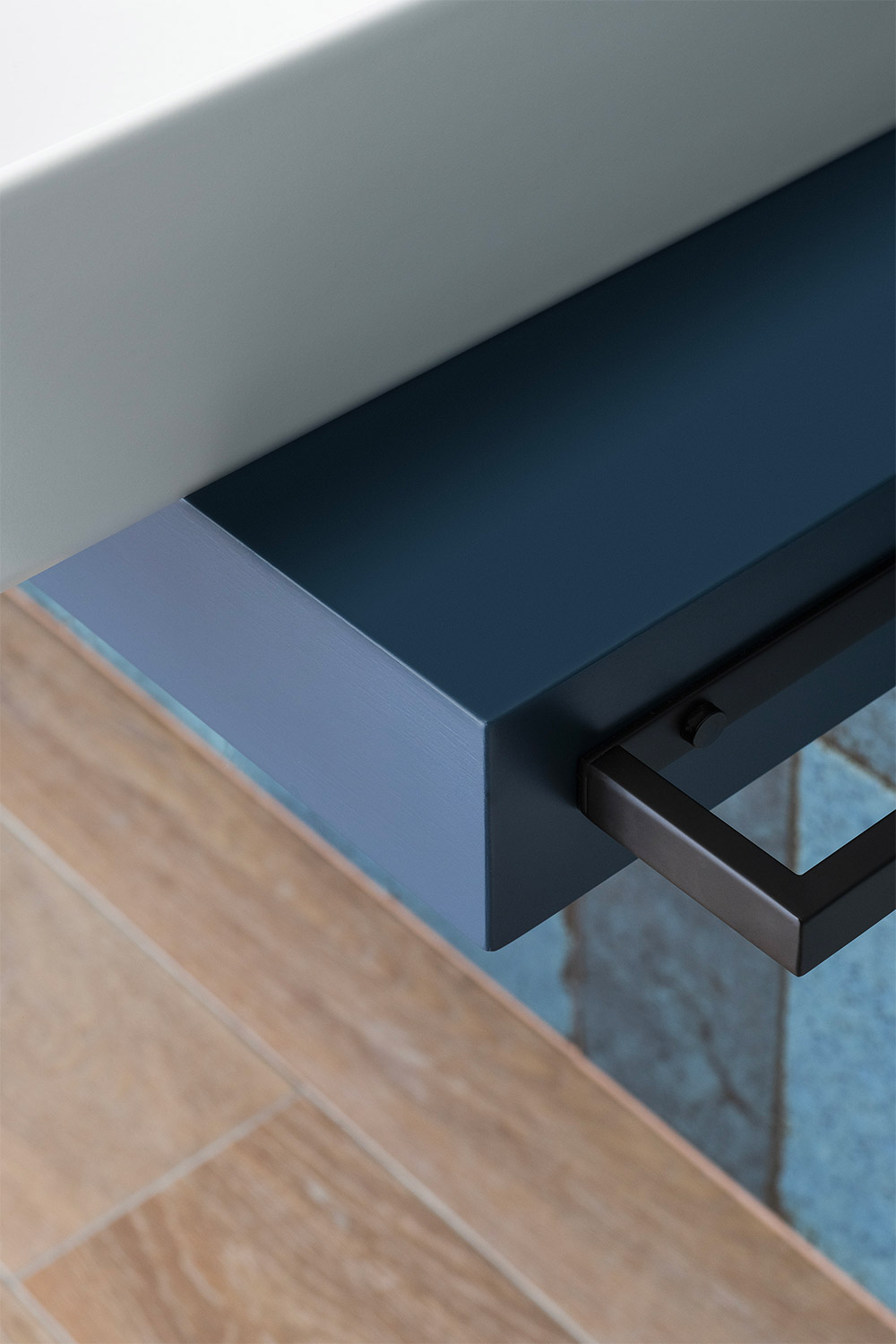 Linee regolari, geometrie semplici e arredi su misura costruiscono un ambiente fluido in cui cucina, pranzo e soggiorno dialogano attraverso ribassamenti che definiscono le funzioni senza interrompere la percezione dello spazio. Il verde, colore simbolico dei committenti, si combina con noce e champagne, creando un linguaggio caldo e ordinato. La cucina su misura integra colonne in noce, dettagli cannettati e un’isola centrale come fulcro. Nella zona notte, toni più scuri e texture tessili costruiscono un’atmosfera intima. Il bagno ospiti è avvolto in un blu intenso che richiama l’acqua, con rivestimento lucido e irregolare che riflette la luce, mobili su misura e pareti in tinta. Il bagno padronale interpreta il tema naturale attraverso un gres moka con texture che ricorda il lino, abbinato ad arredi in legno e a nicchie ricavate nel volume doccia.