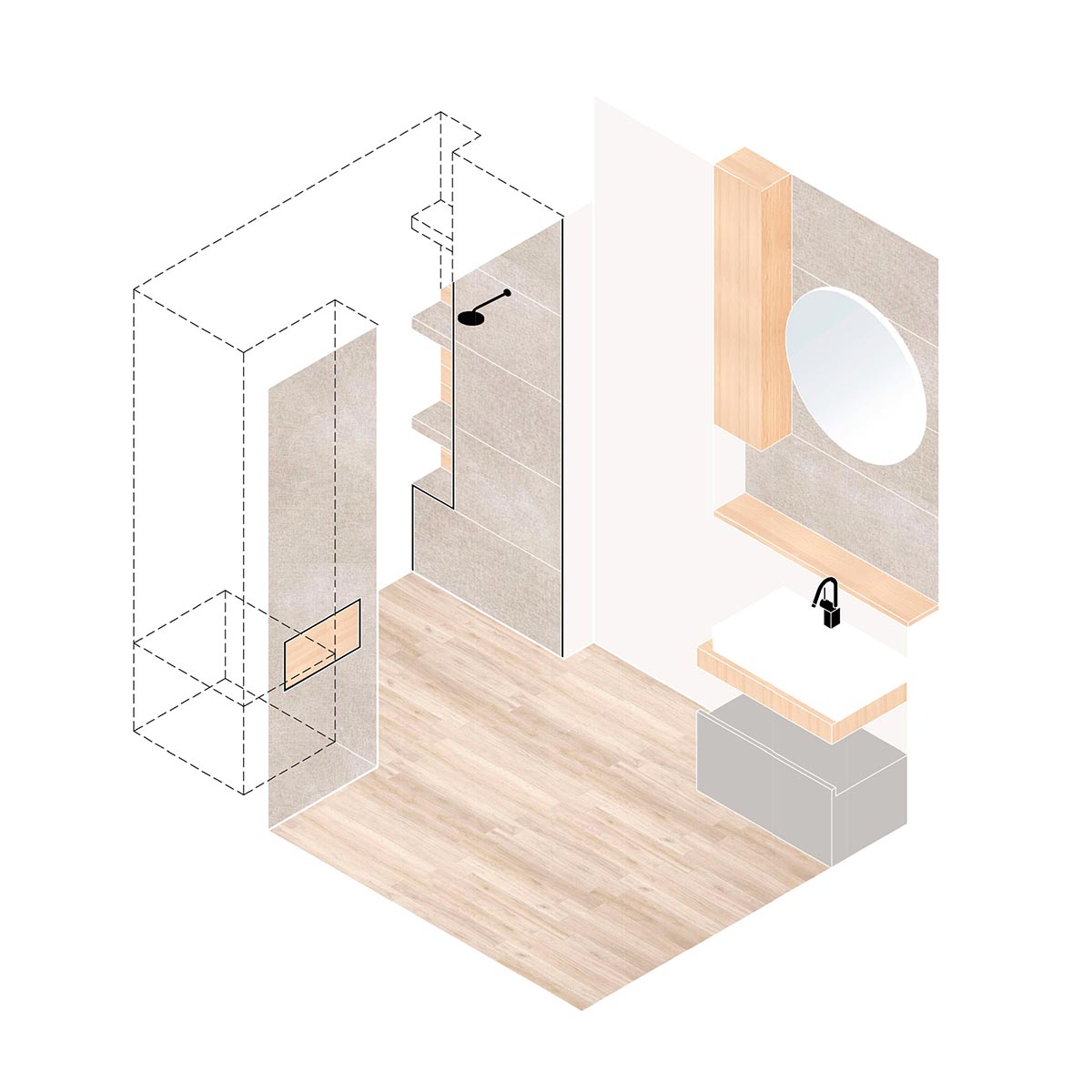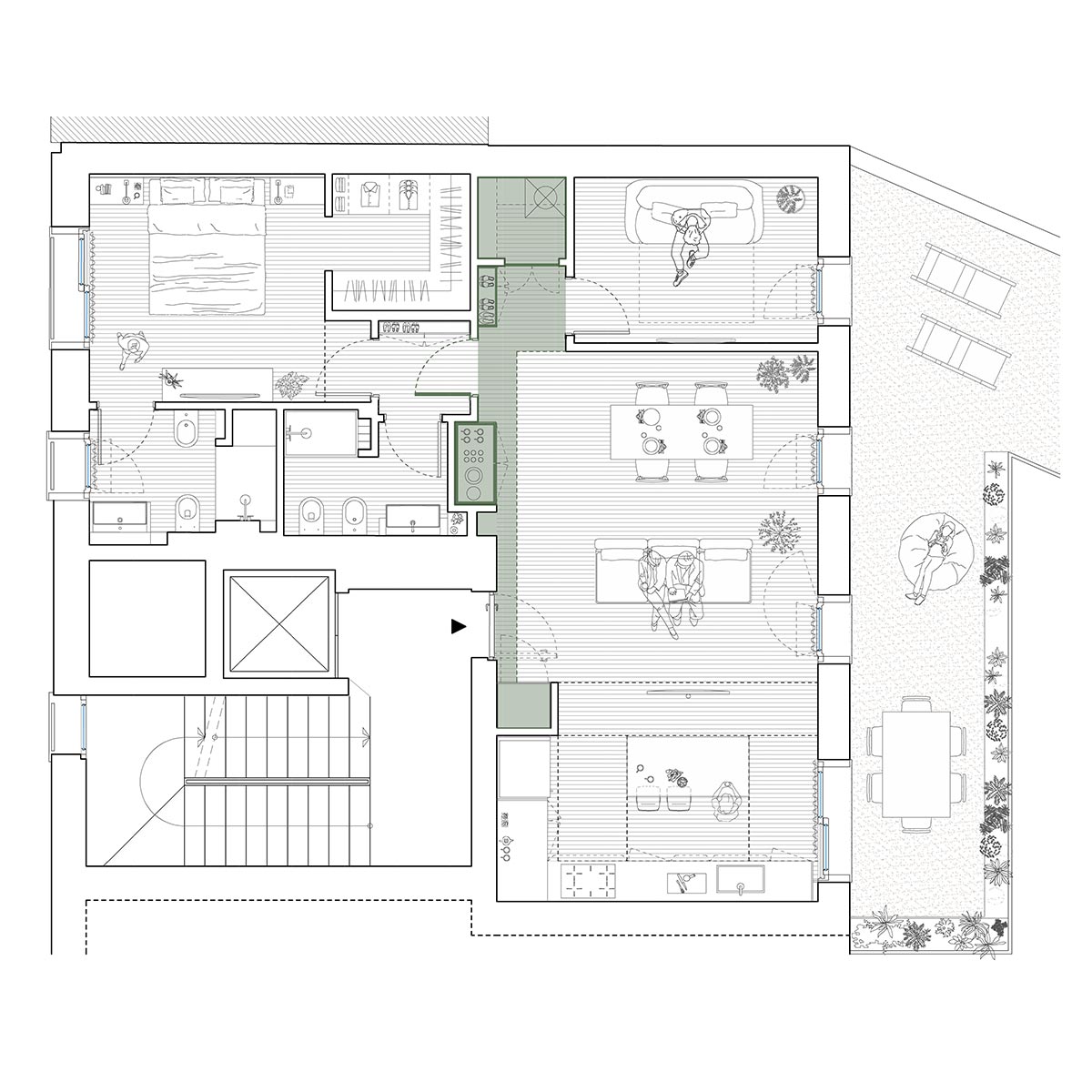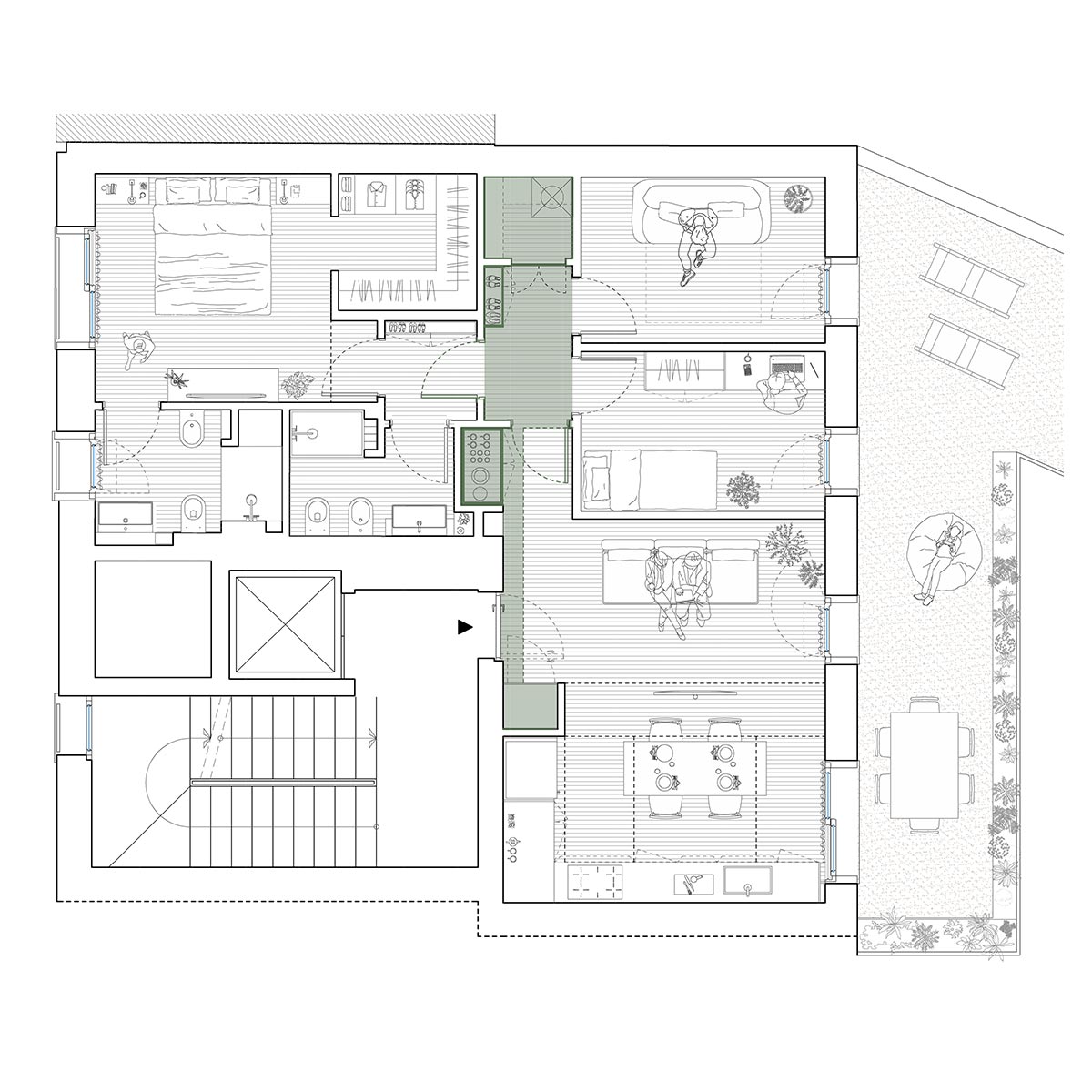 Il progetto nasce dall’esigenza di una giovane coppia di vivere in spazi più ampi e funzionali, integrando guardaroba, ripostiglio e lavanderia in un unico living continuo.